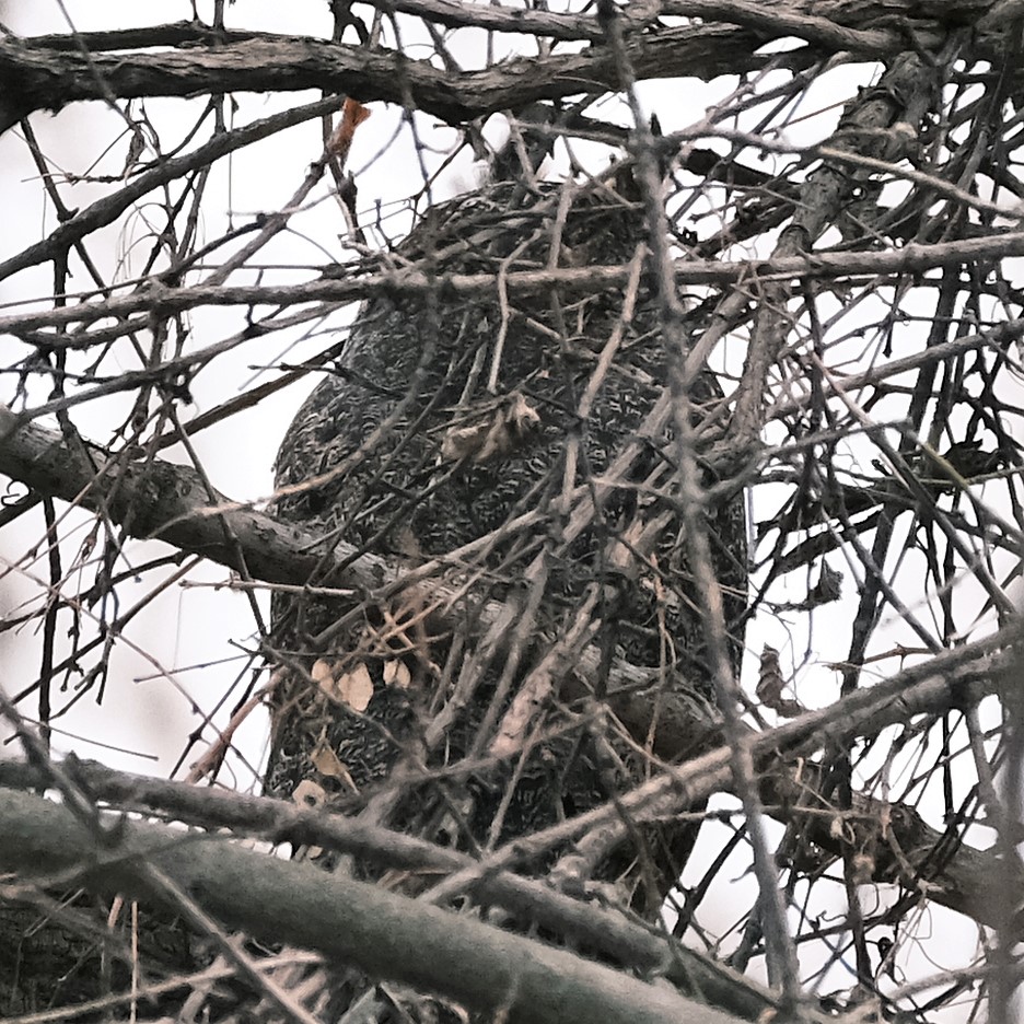 The great horned owl was in its regular spot again, but the lighting this morning really helps to make it visible through the brush.