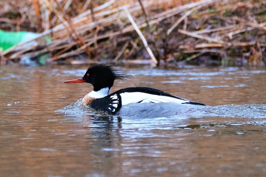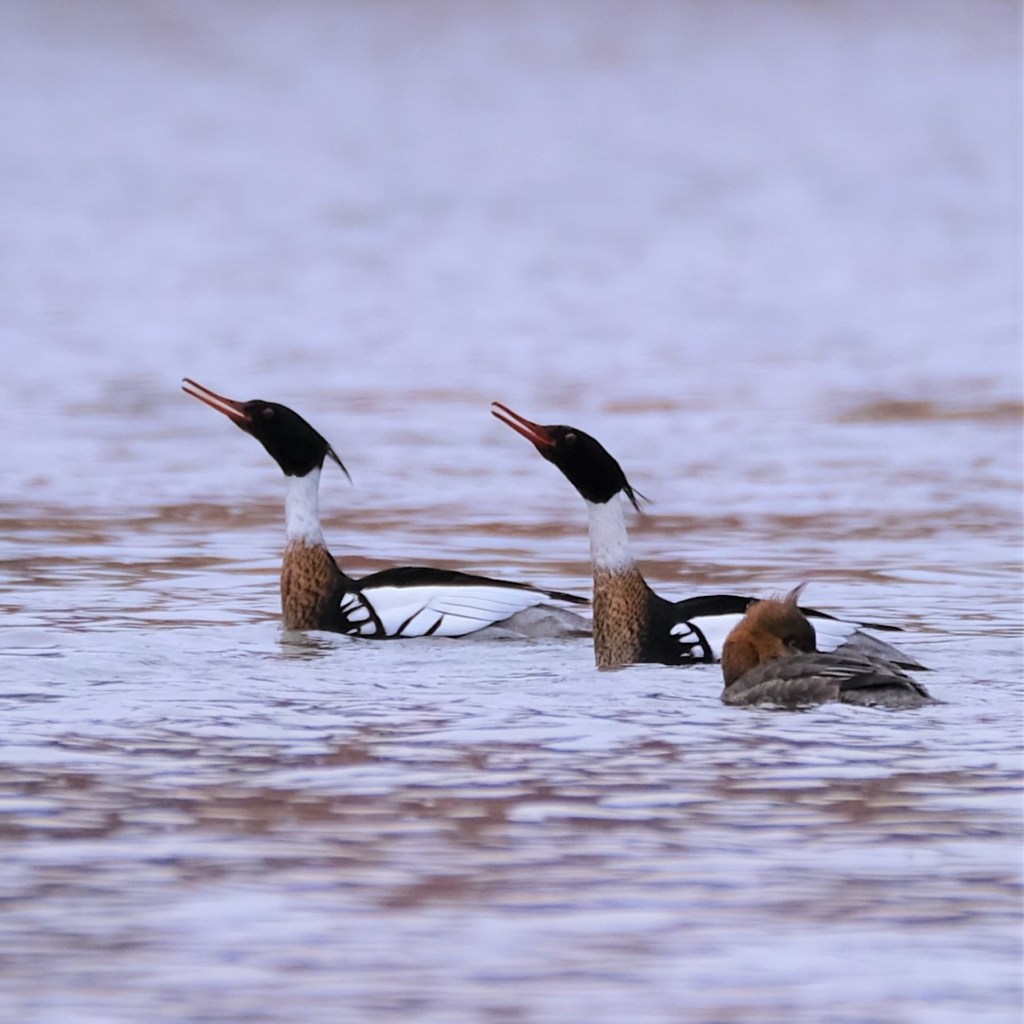 When I approached the northern island, however, things really started to warm up. Besides the geese, mallards, and wood ducks, there was still one pair of buffleheads from the big crowd yesterday, and four more red-breasted mergansers. With three drakes and just two hens, I guess I shouldn’t have been surprised when the drakes started putting on a show. Sadly, the hen seems to be nowhere near as impressed as I was.