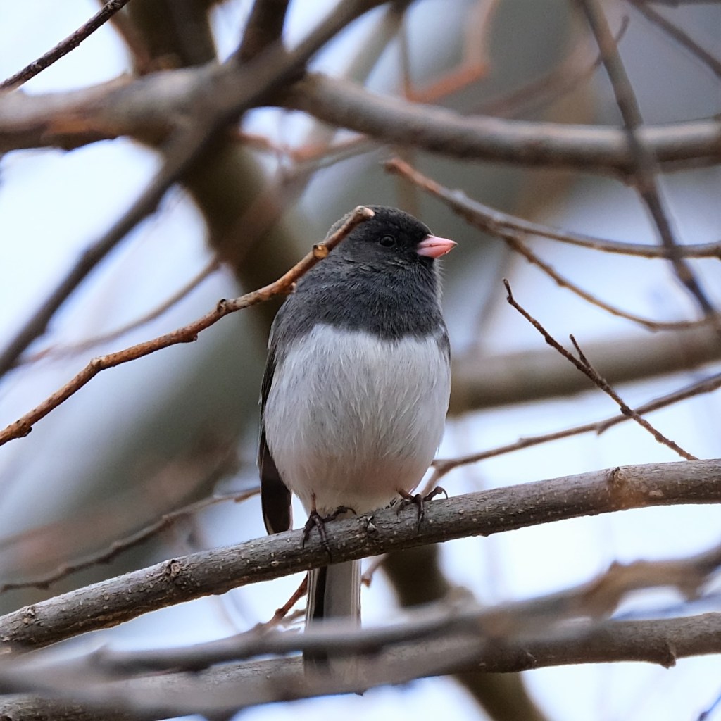 Meanwhile, back at eye level, I was thrilled to discover that today must have been portrait day because all the little birds started posing, and first up is this little dark-eyed junco.