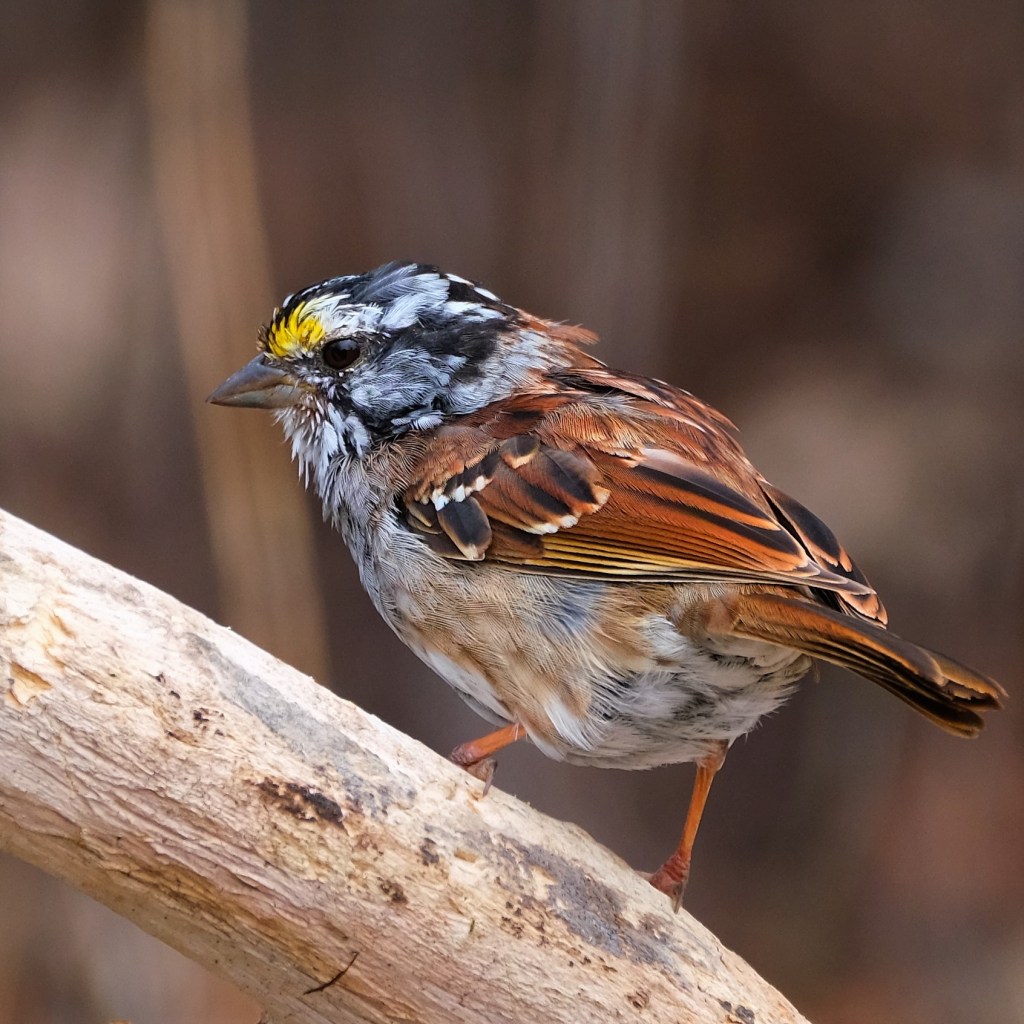 And lastly, this slightly-ruffled looking white-throated sparrow must have gotten word late and came as fast as it could.