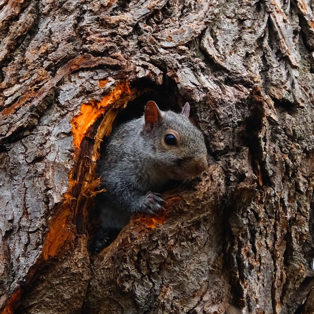 This gray squirrel peeking out from its hidey-hole.
