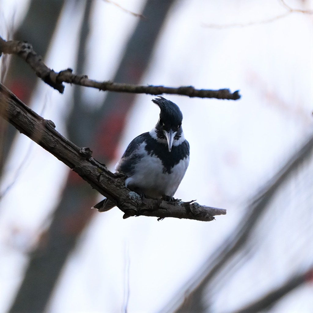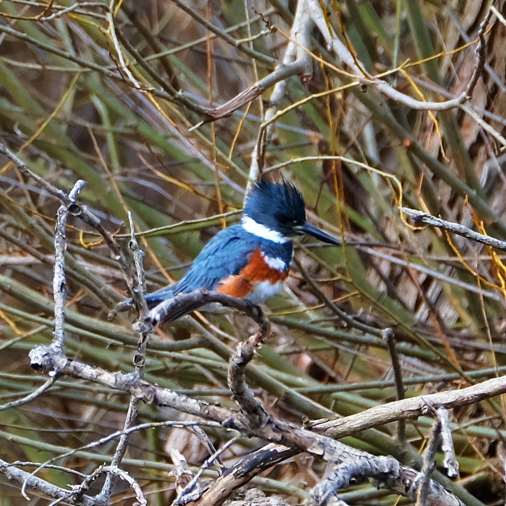Also on the river, I saw both a male and a female belted kingfisher fishing at different points. Here’s the male, with his plain white belly, below the falls, …