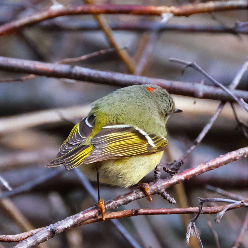 Another new bird for the season is this ruby-crowned kinglet, who was doing its very best to avoid showing us its ruby crown!