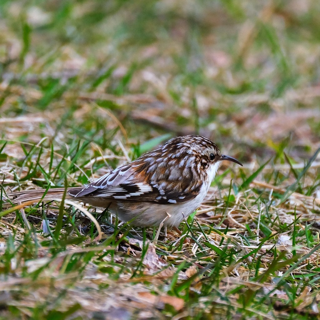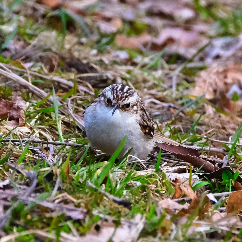 Here are a couple of pictures of a brown creeper from Monday, when the warblers took top billing. I was surprised to find it creeping across the lawn, instead of up the side of a tree or along the bottom side of a branch.