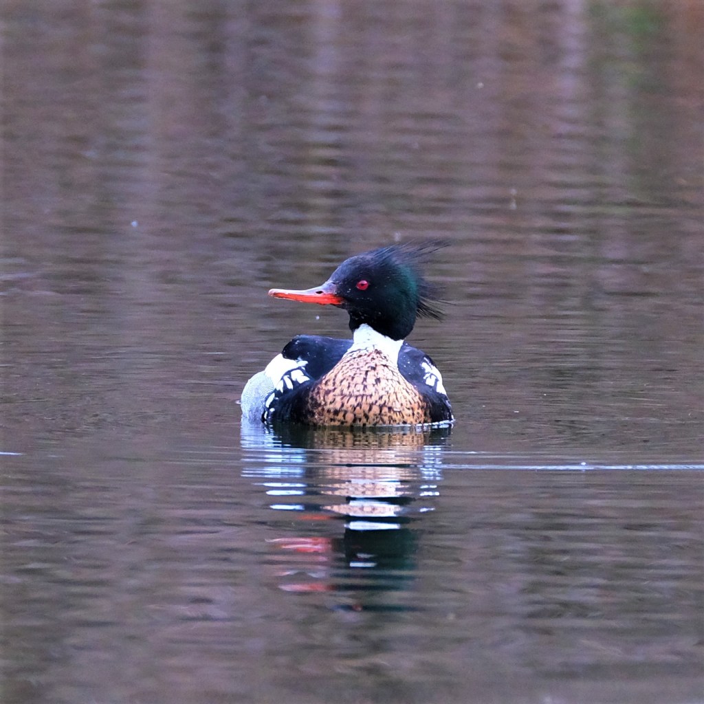 To makeup for the picture shortfall today and tide us over till tomorrow, here’s the solo red-breasted merganser drake from on the pond yesterday.