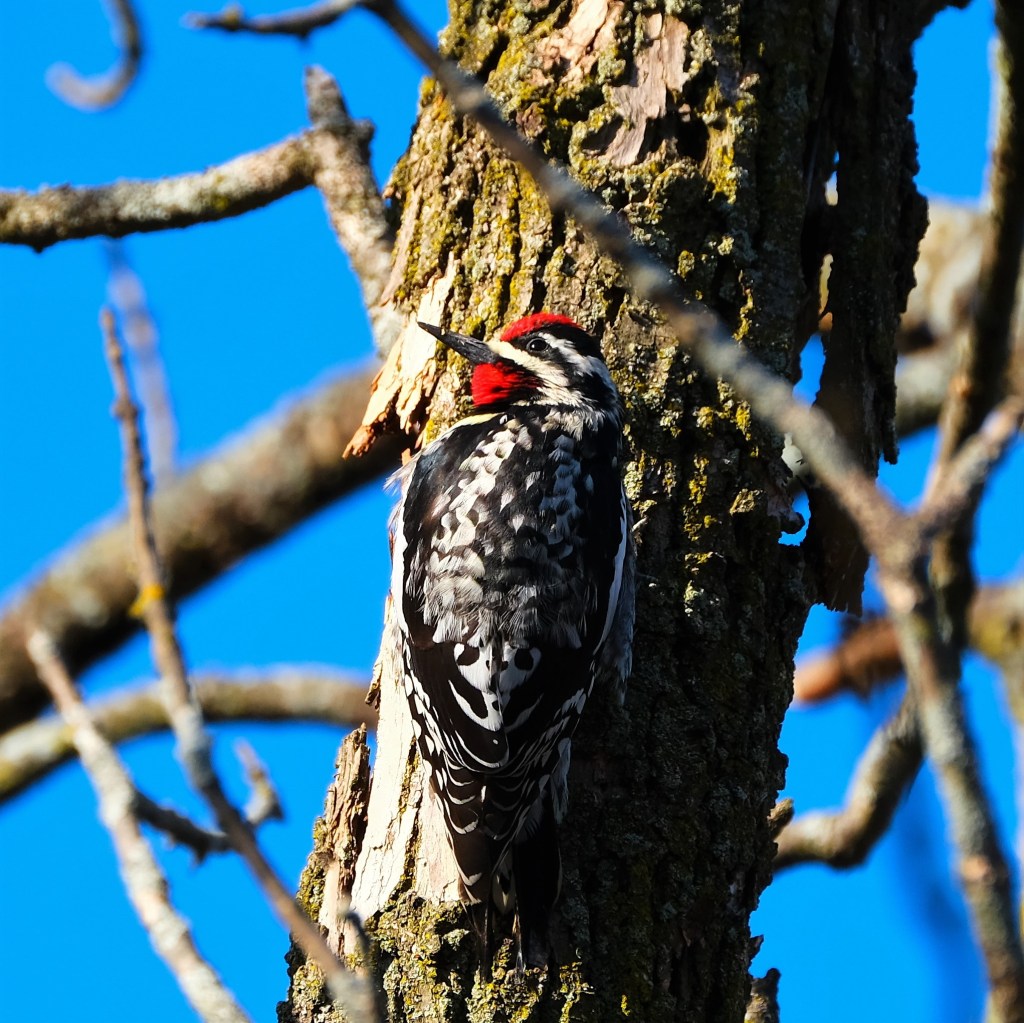 My best picture today is this of yellow-bellied sapsucker hiding his yellow belly from us at the moment. Otherwise he looks a lot like a hairy woodpecker, with that big beak and black-and-white pattern on his back, but take a look at the hairy woodpecker picture from back on January 8, 2022 to see the difference.