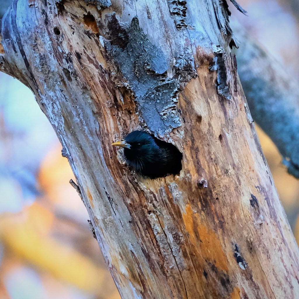 As I came north along the river, I spotted a European starling that has selected a nesting cavity, more natural than the back side of the police station and probably excavated by one of the many woodpeckers in the area, and was already hauling in nesting material.