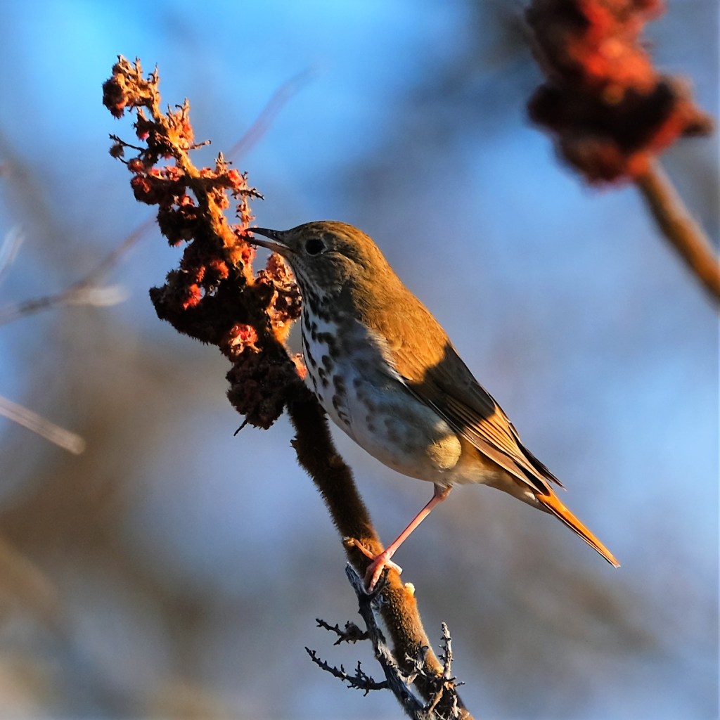 And a hermit thrush gleaning seeds from last years’ staghorn sumac.