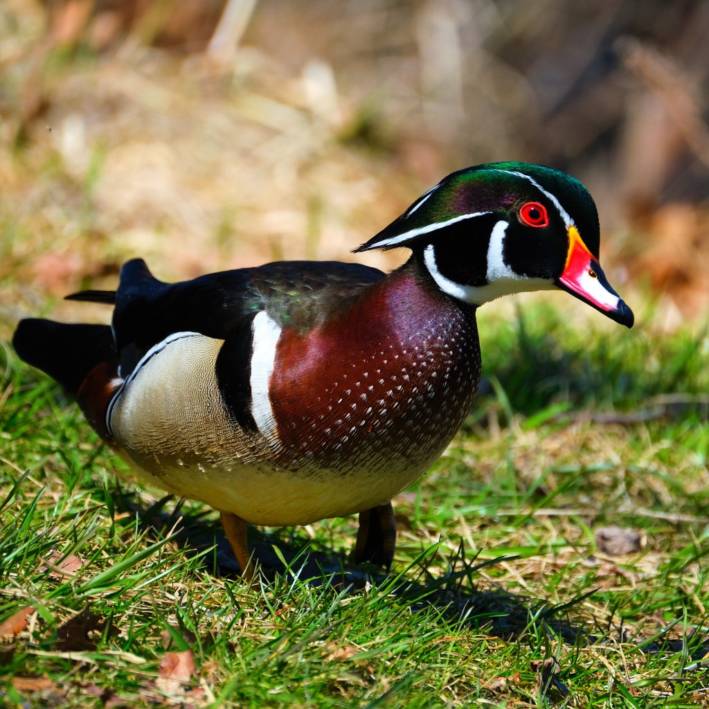 The wood ducks were also up and about at the pond, and this drake appears to be wondering if I brought it any snacks. Sorry, little dude.
