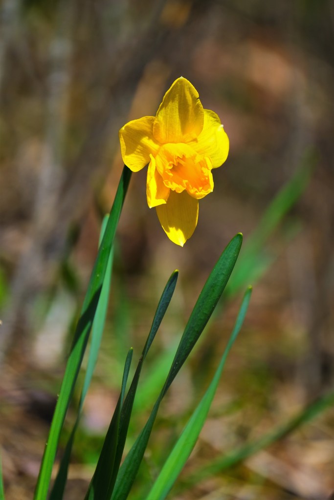 Finally, back on the ground, there are more flowers up. First is this daffodil by the pond.