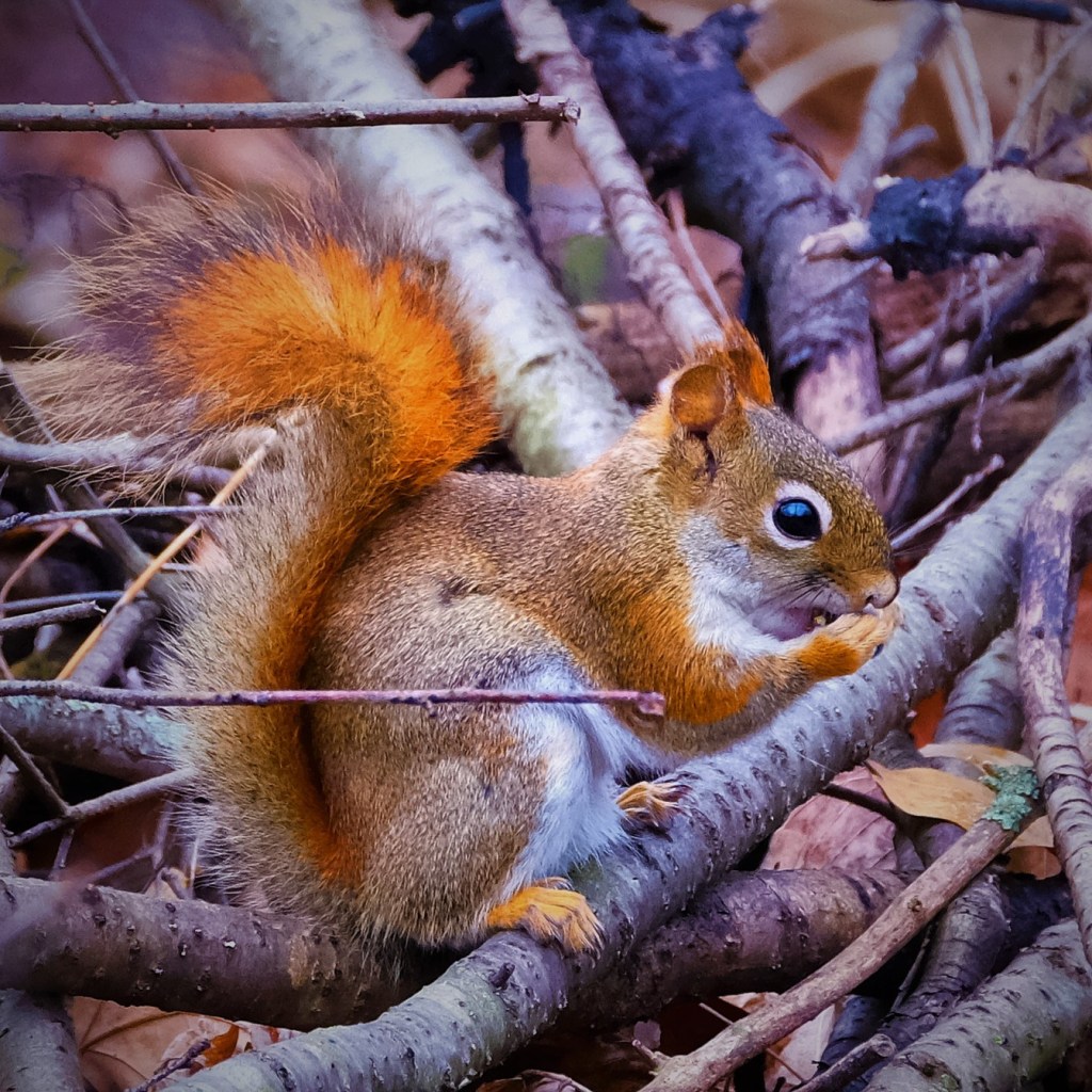 I also spotted another palm warbler and my first common yellowthroat of the season, but failed to get pictures of either one, so I headed down to the river. On my way, I spotted another red squirrel from the bridge north of the beer garden.