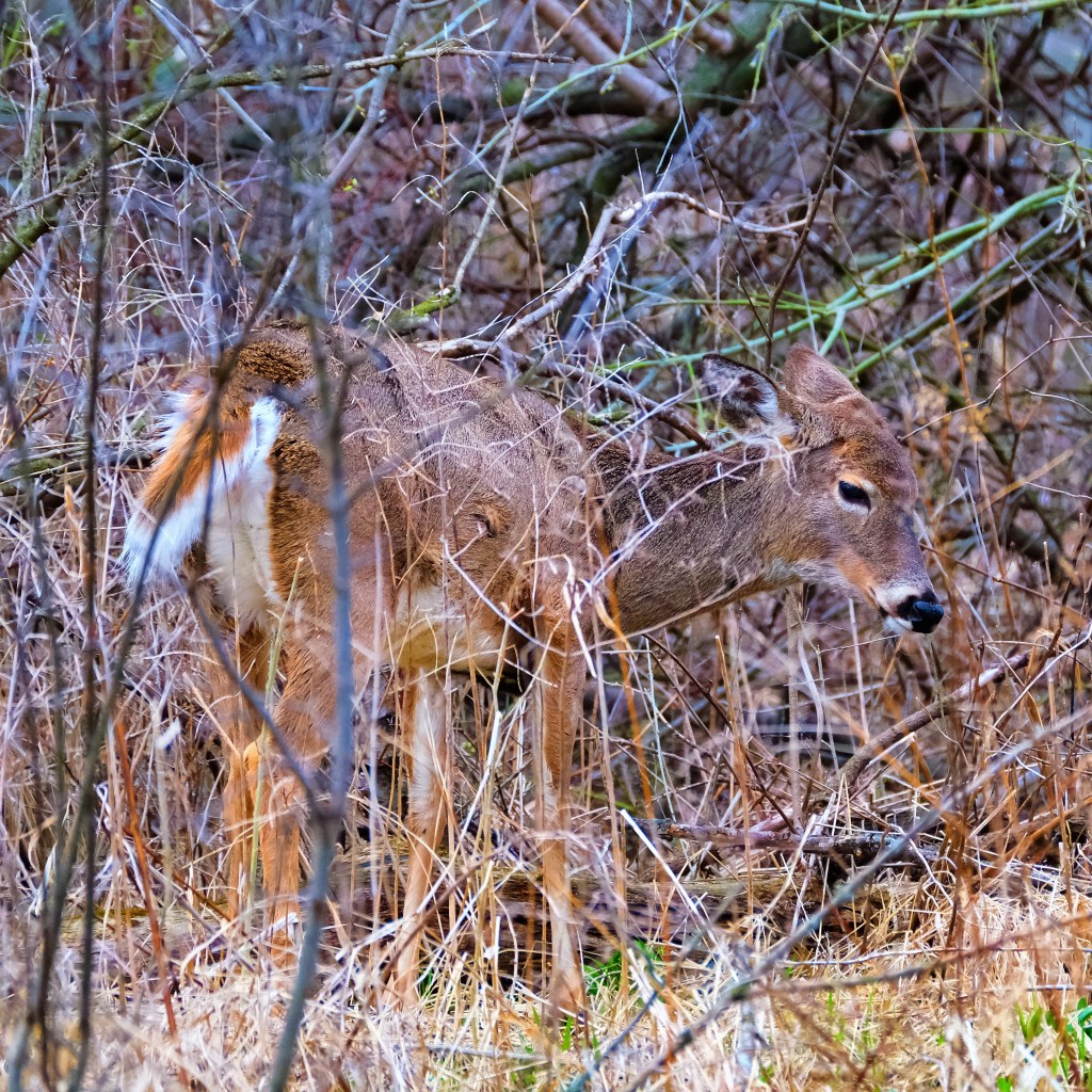At the river, as I was checking on the great horned owl, who was “in” this morning, but too deep for a good picture, I saw our first island deer of the season right below it.