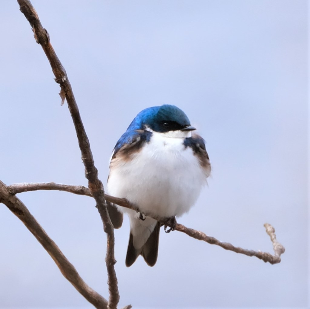 Best of all, there were three (3!) different species of swallows in that little flock. Here’s the one tree swallow with its bright white throat. The images are all a little fuzzy because I had to shoot through the dense thicket you can see above. I’m amazed they came out as clear as they did.