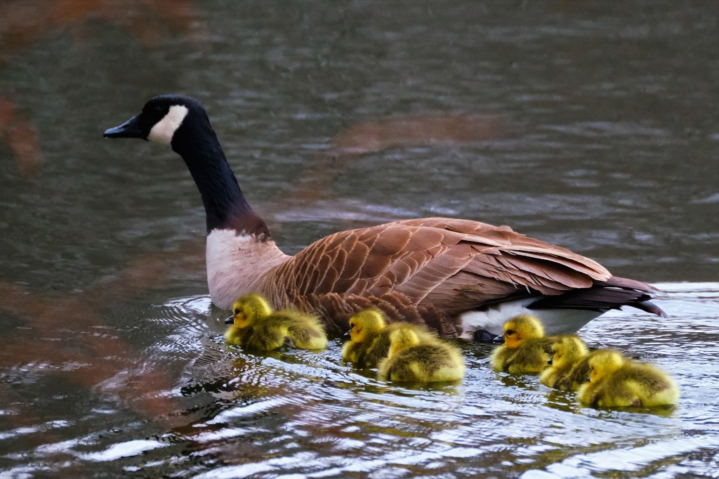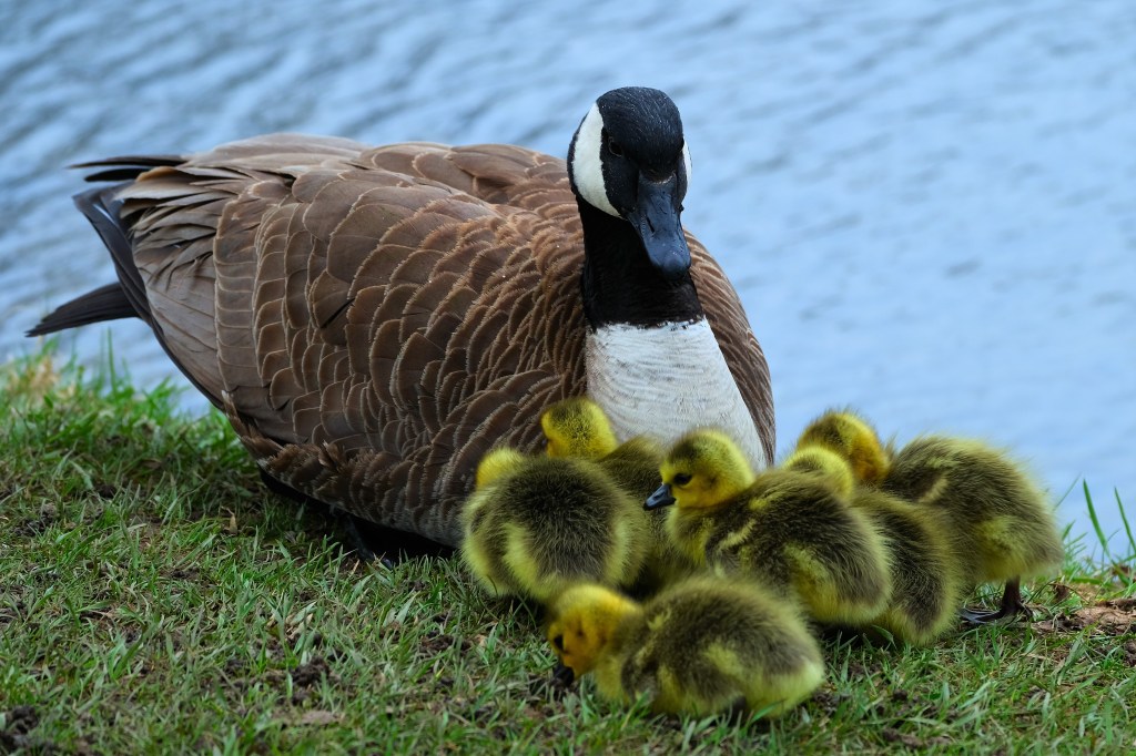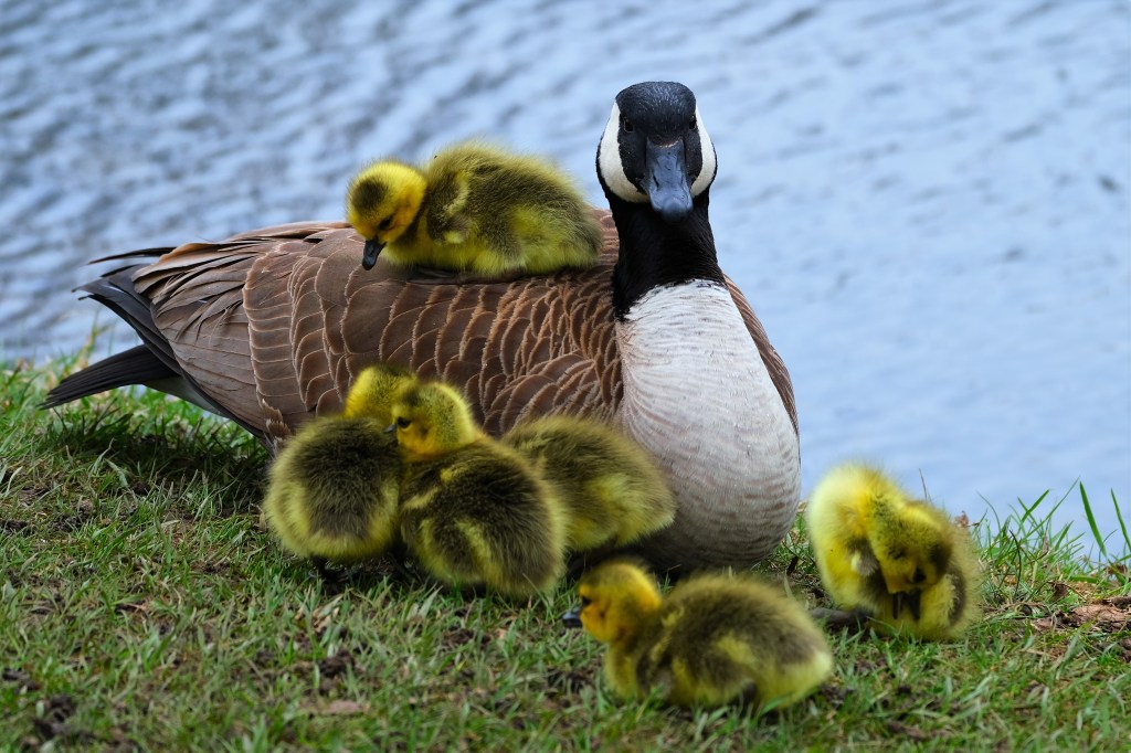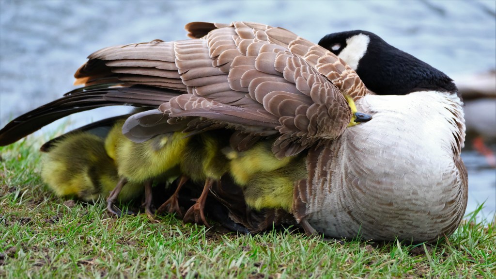 I didn’t have to wait long, however, until Mom, Dad, and six little goslings popped right up onto the lawn with me, and it appears that everyone was ready for a nap.