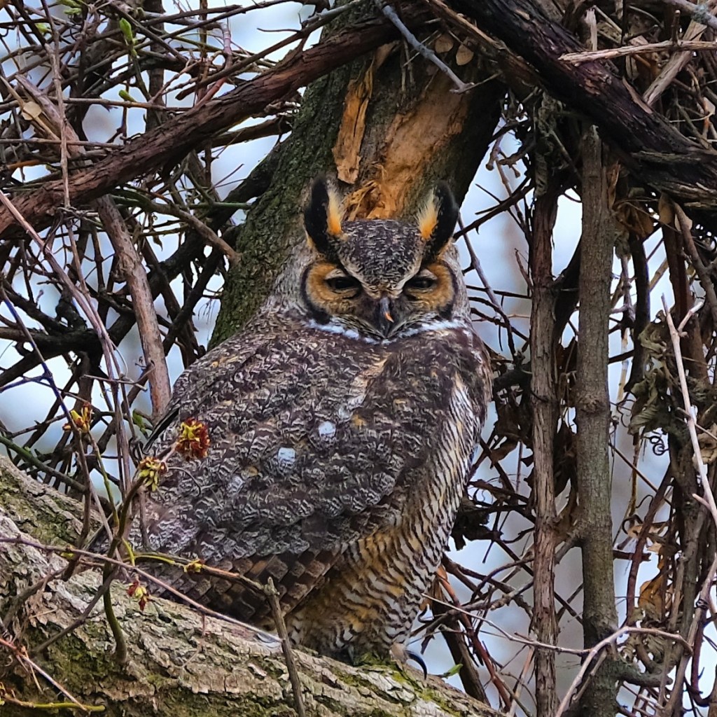 I eventually headed back down to the river, and I could not believe my luck today to find our usual great horned owl out in the open for a change.