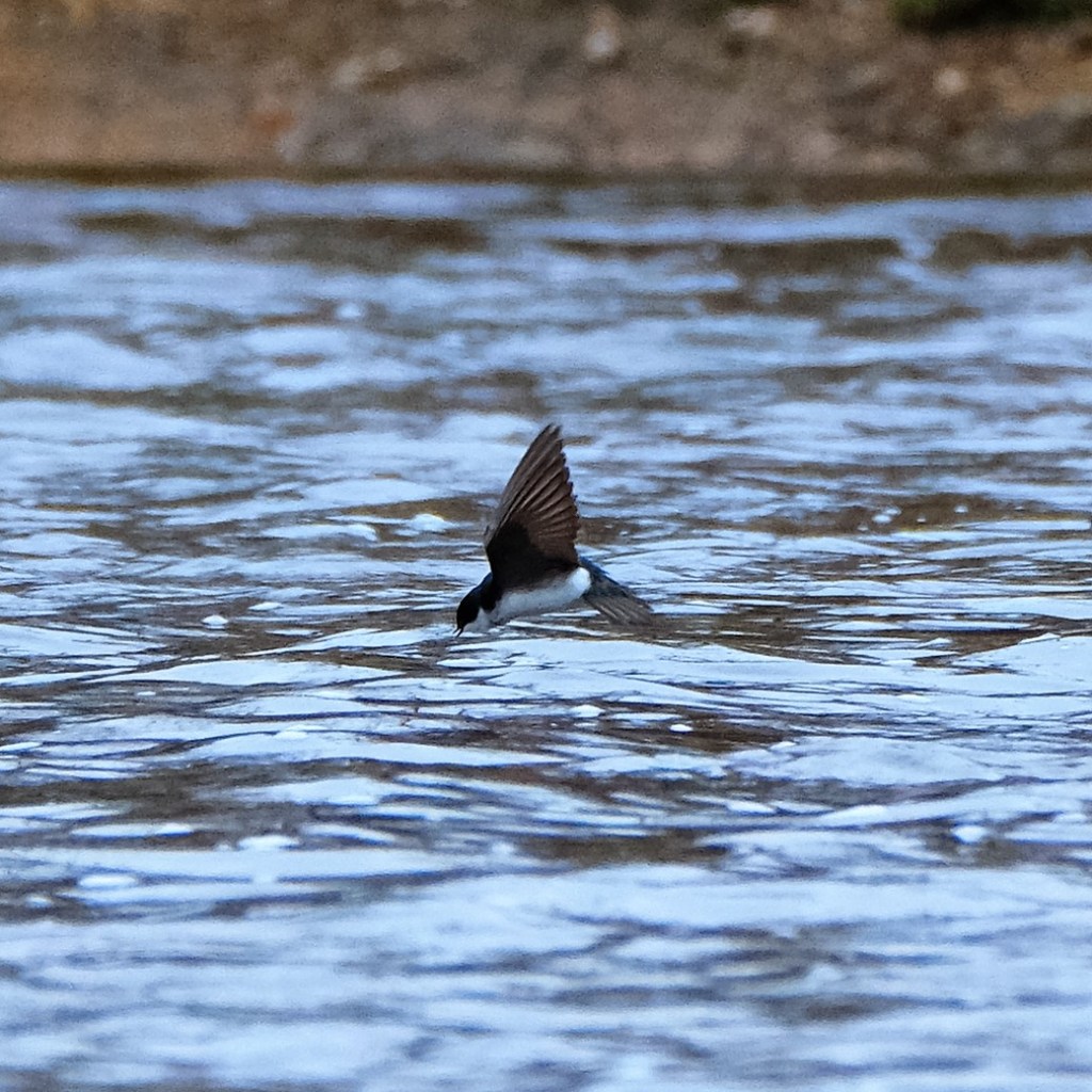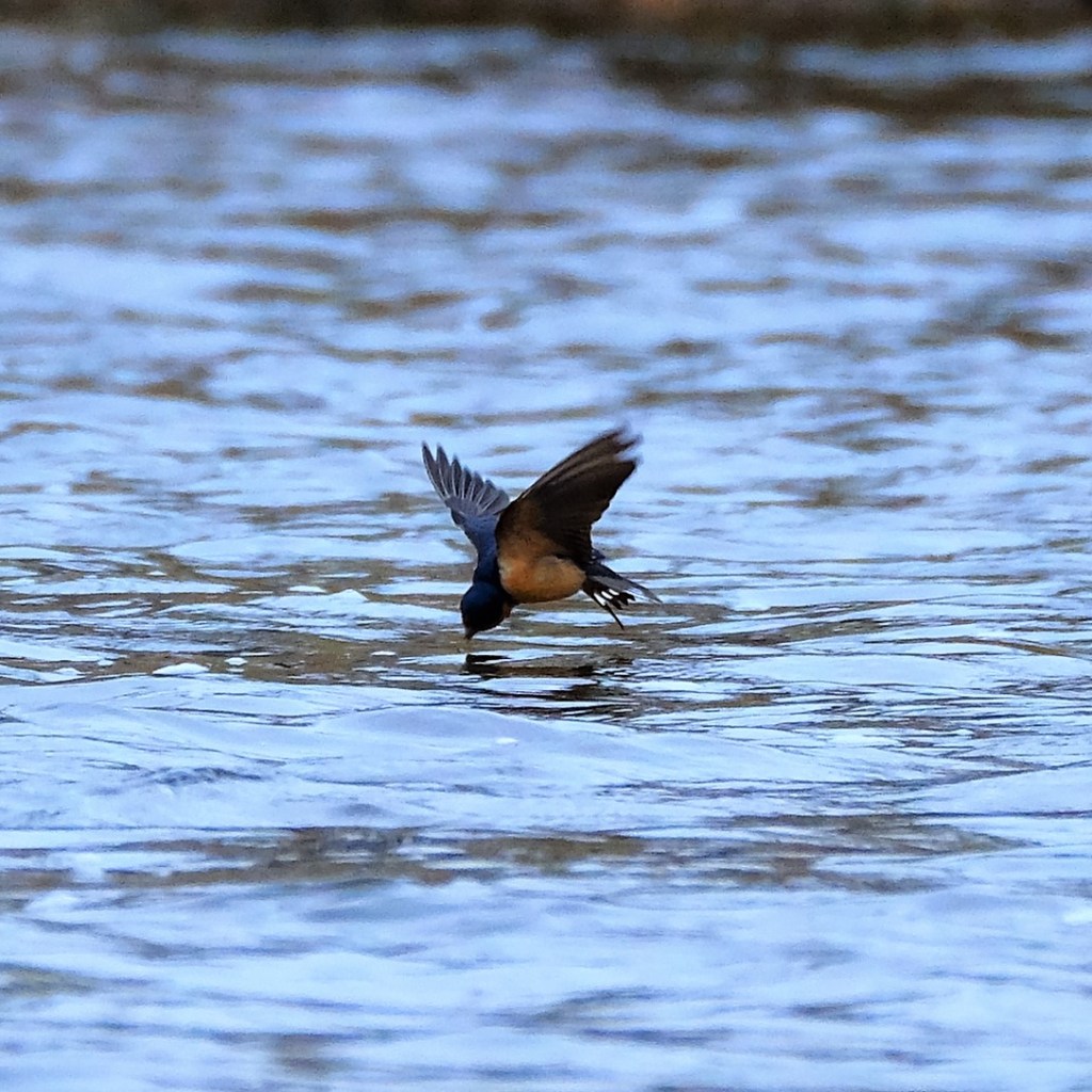 Anyway, the swallows we saw yesterday were up from their nap by the time I got to the north end, and they were busy hunting bugs out over the water. It was way too dark for my camera to get good action shots today, but I couldn’t help but try, and here’s the barn swallow, with its “rusty” face, “tawny” underparts, and fancy, white-striped tail, plucking something off the surface of the water.