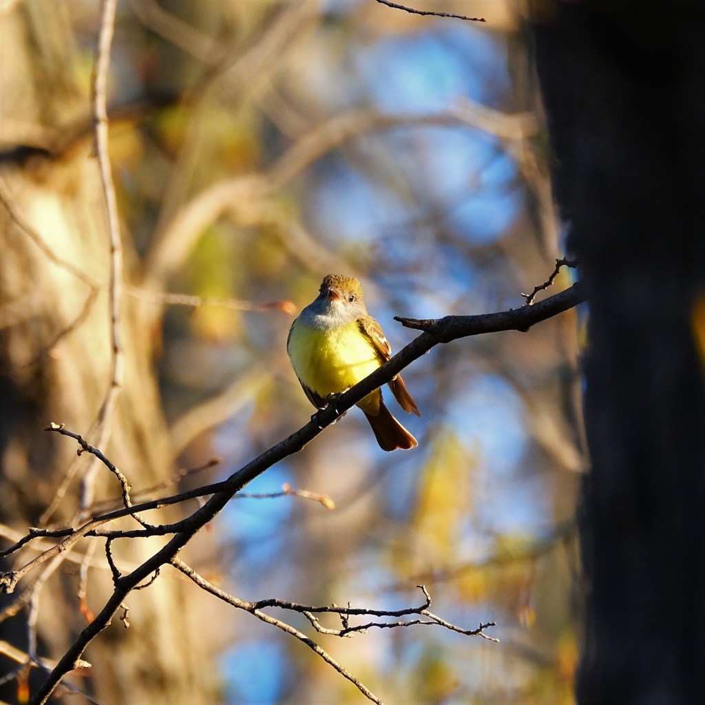 Okay, on to the new arrivals, and first up is this great crested flycatcher with its creamy yellow belly, whitish neck, and brown head. There were two of them, and they’ve just arrived from the southern half of the Gulf of Mexico or even farther south.