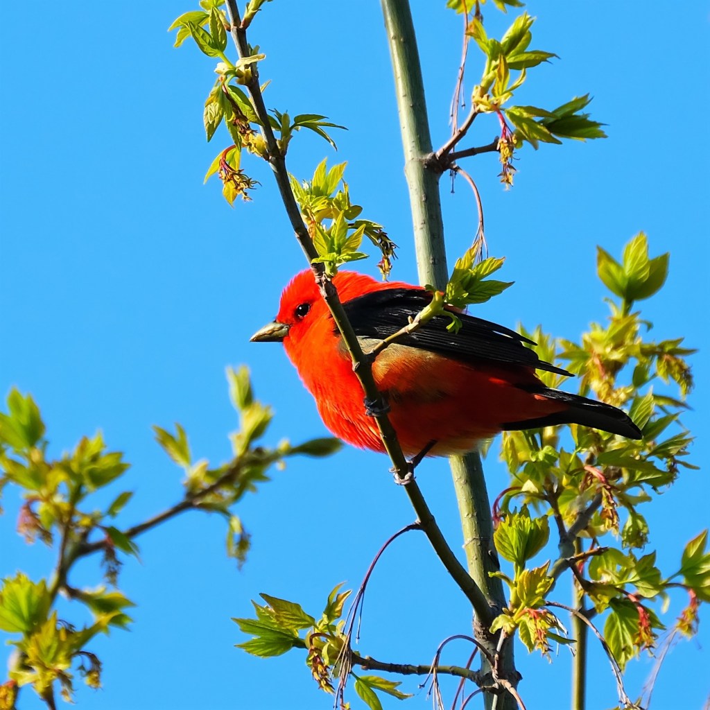 As if that wasn’t enough, wait till you get a load of this guy! He’s our first male scarlet tanager for the season, and he’s come the farthest of the three, all the way from western South America. I read that “twice a year, [they] fly across the Gulf of Mexico,” and “usually at night!” Yikes!