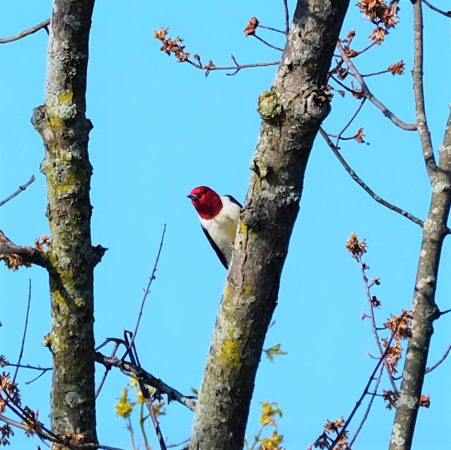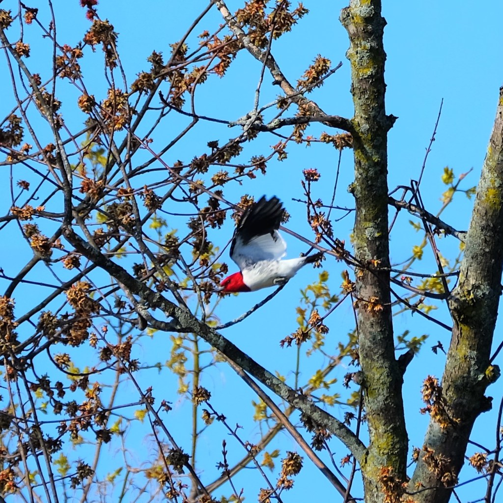 Best of all, at least for me, I’ve saved the most amazing for last. We’ve seen all three of the birds above at least once before in Estabrook, but I’ve been searching for this next bird since I first learned two years ago that red-bellied woodpeckers are not these, despite their obvious, bright-red heads. At long last, here is the first red-headed woodpecker (Melanerpes erythrocephalus) that I’ve ever seen in Estabrook Park and maybe even anywhere.