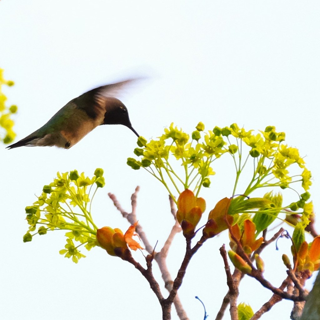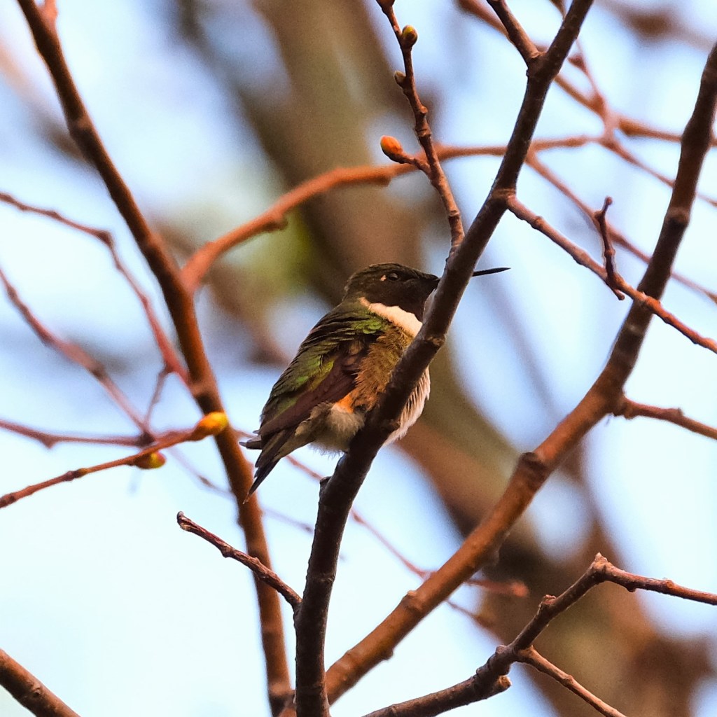 I know its “ruby” throat looks mighty dark, and I looked up the black-chinned hummingbird, but their range doesn’t extend east of the Rockies, so it must be just a trick of the light. In fact, the fine folks at the Cornell Lab of Ornithology suggest that “in some lights the throat of the adult male can appear black,” and we had “some” light this morning. In any case, here it is sipping nectar from tree blossoms, which I did not know they would do.