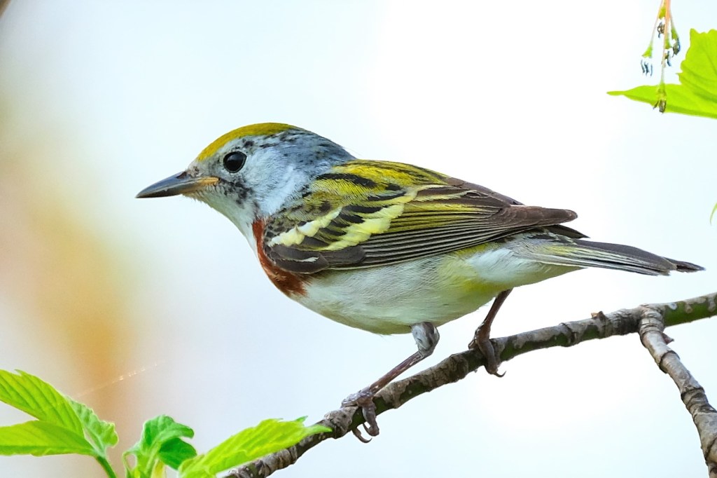 Back up on the bluff and just before the cool wind blew in from the lake, I spotted this darling female chestnut-sided warbler. Her slim appearance, compared to this plump-looking male by the pond from last year, should give you some idea of how warm it was this morning.