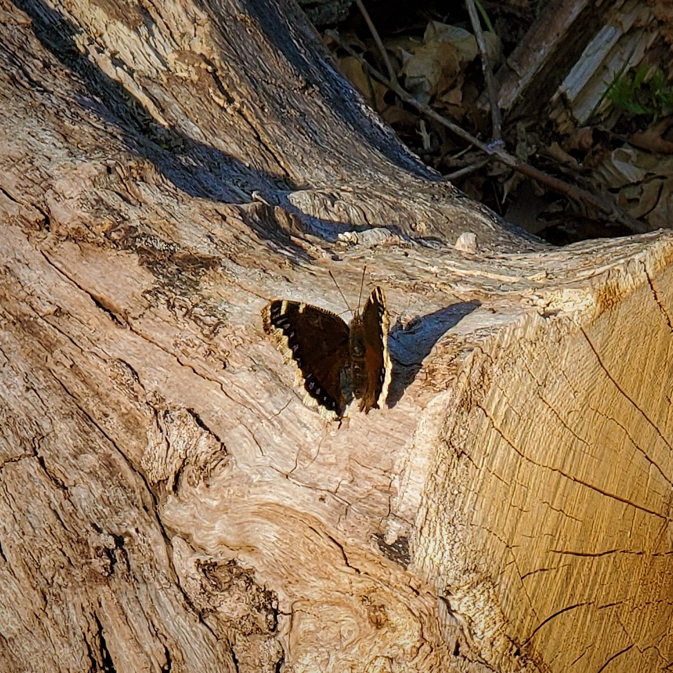 Anyway, I’ve been seeing butterflies lately, and yesterday evening I finally managed to catch one sitting down, if only with my phone, and here it is, a mourning cloak fresh out of hibernation.