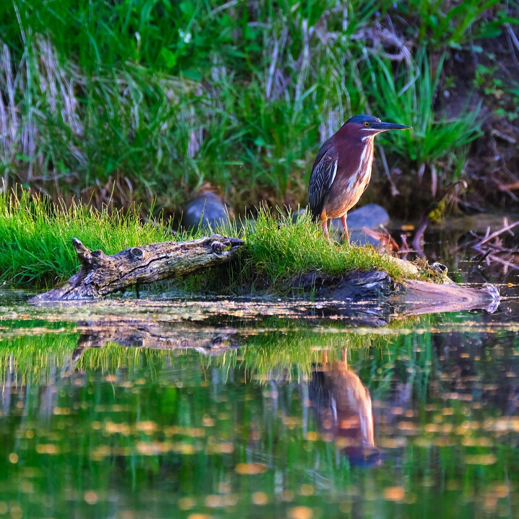 I soon became worried, however, that all the warblers had already continued their journey north, but I was happy and relieved to discover instead that perhaps they were just waiting for the sun to warm things up a bit. In the meantime, here’s a green heron already fishing on the pond.