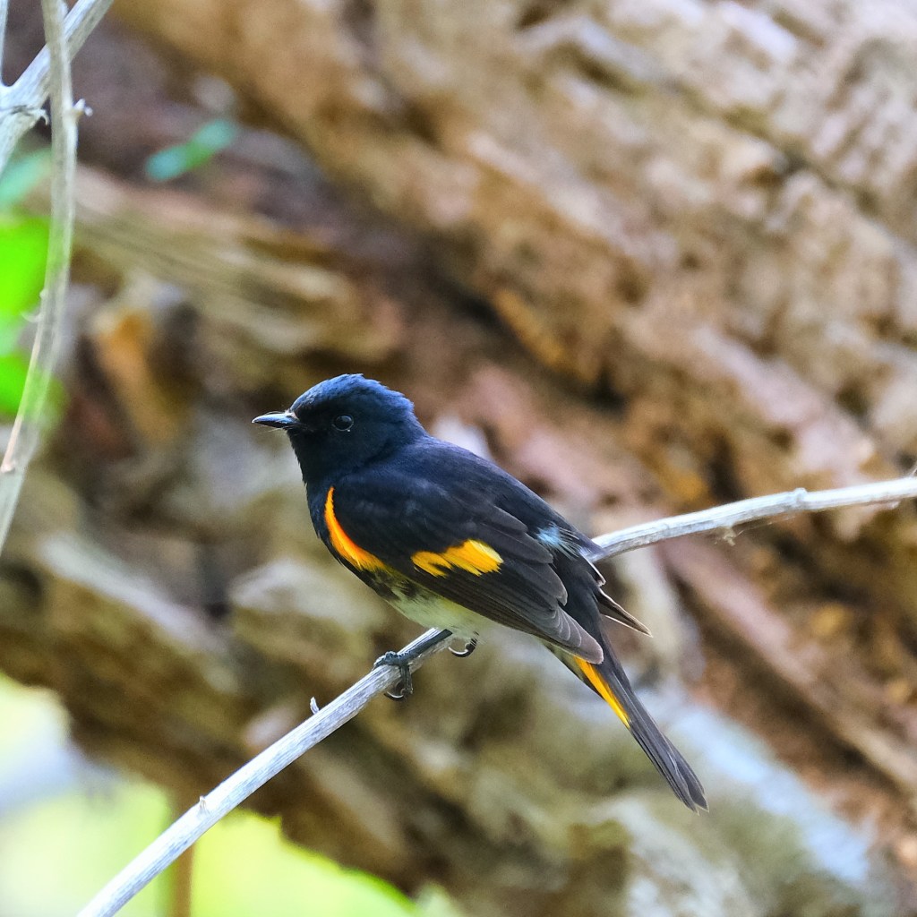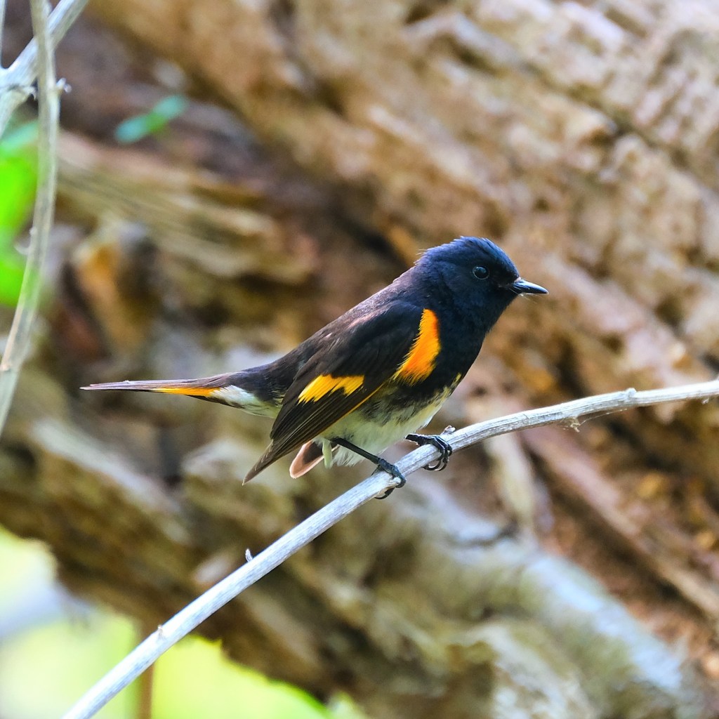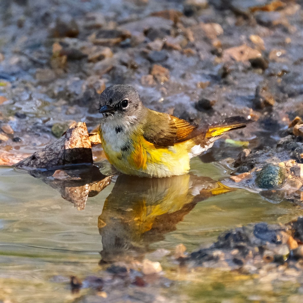 Once the warblers did wake up, I saw my very first blackpoll warbler ever today, two of them, in fact, but I failed both times to get a picture. Sorry about that. Instead, here’s a female American redstart taking a bath in a tiny puddle right in the middle of the river path.