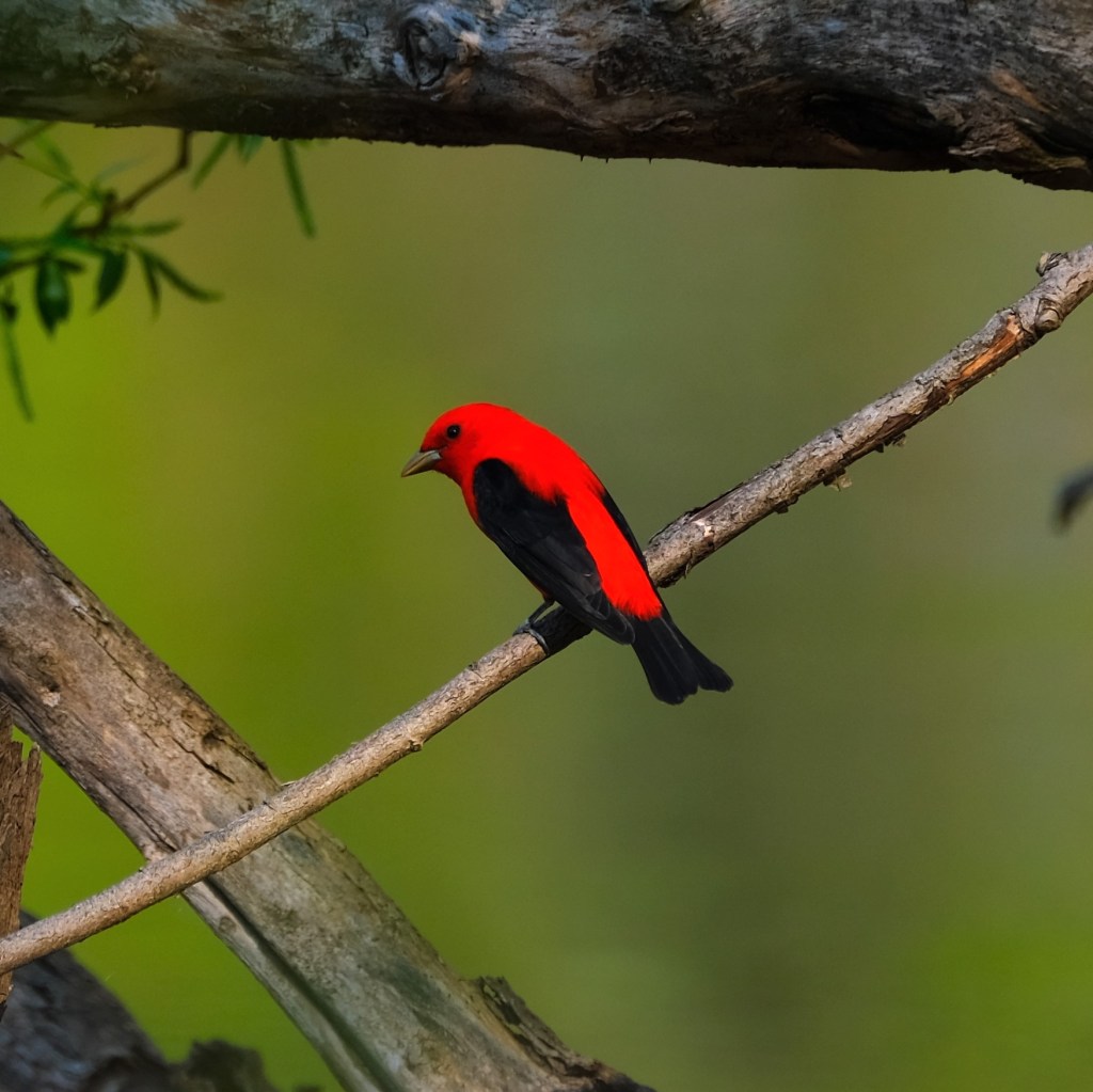 As I was trying to get a picture of her drying off on a nearby branch, look who else showed up: another scarlet tanager!