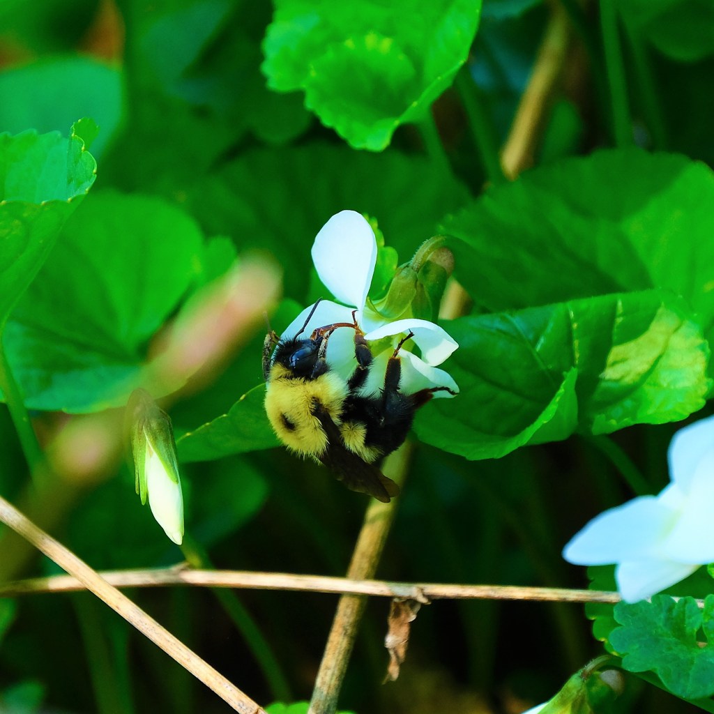 Finally, the bumblebees are back at work, and here’s one on a white violet blossom. Thanks to everyone participating in No Mow May, Lois! Your lack of effort may be paying off already!