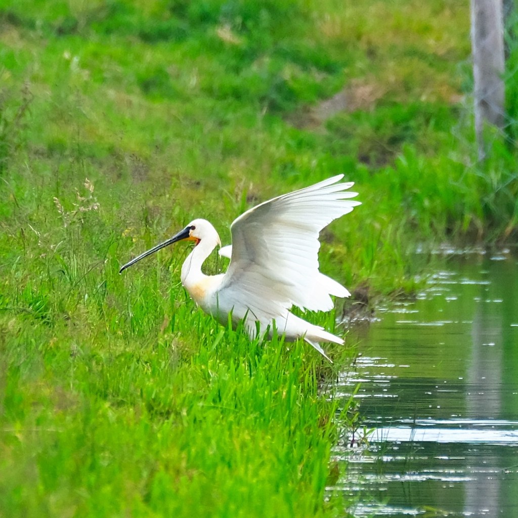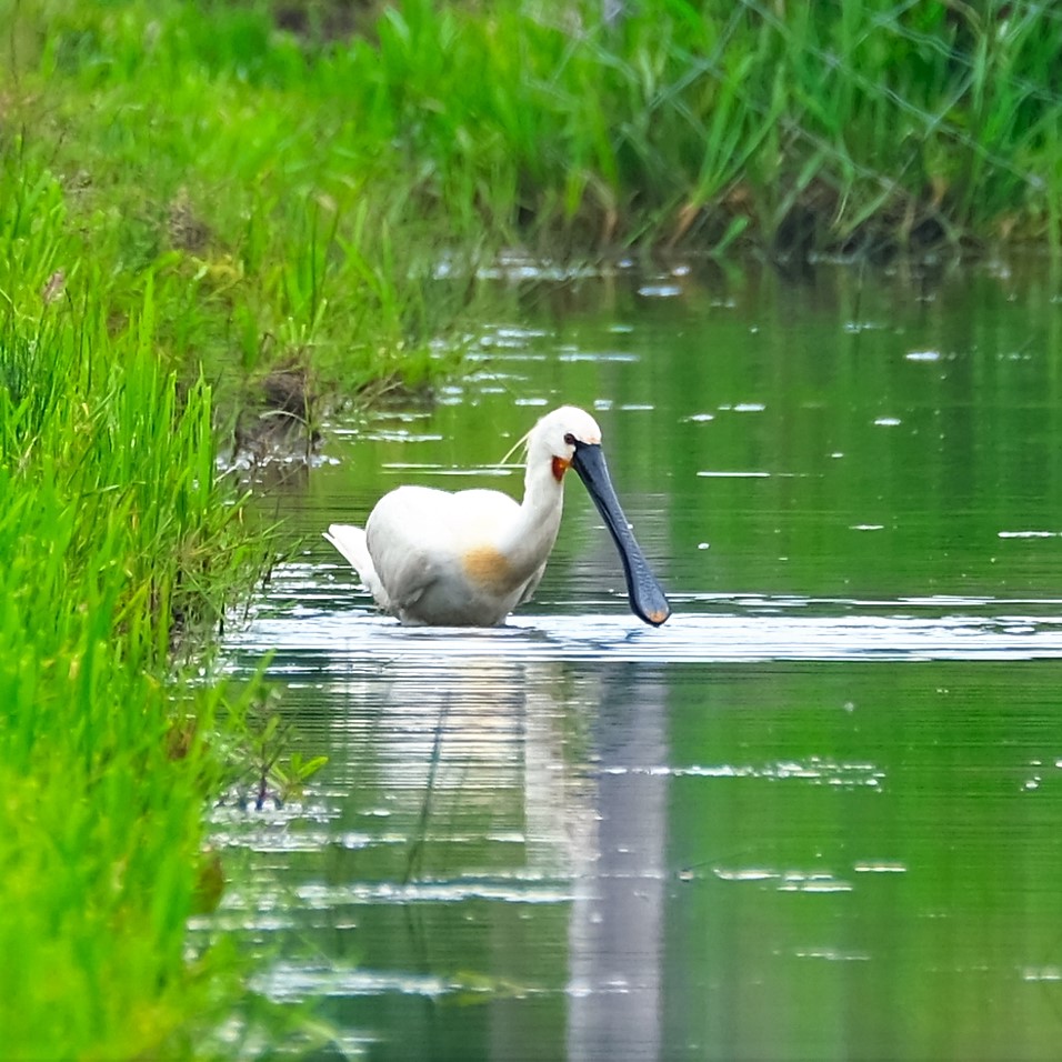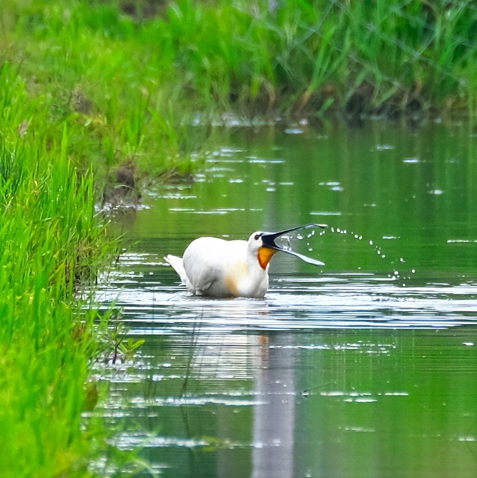 I was just riding a long and saw a big white bird land in the distance. I thought maybe it was an egret or even a stork, but when I finally spotted it down in a little canal between two fields, it turns out to be a Eurasian spoonbill (Platalea leucorodia)! Holy Living Eating Utensil, Batman! It was about 200 yards away, so really at the limit of my gear, but these images are at least good enough for a positive ID.