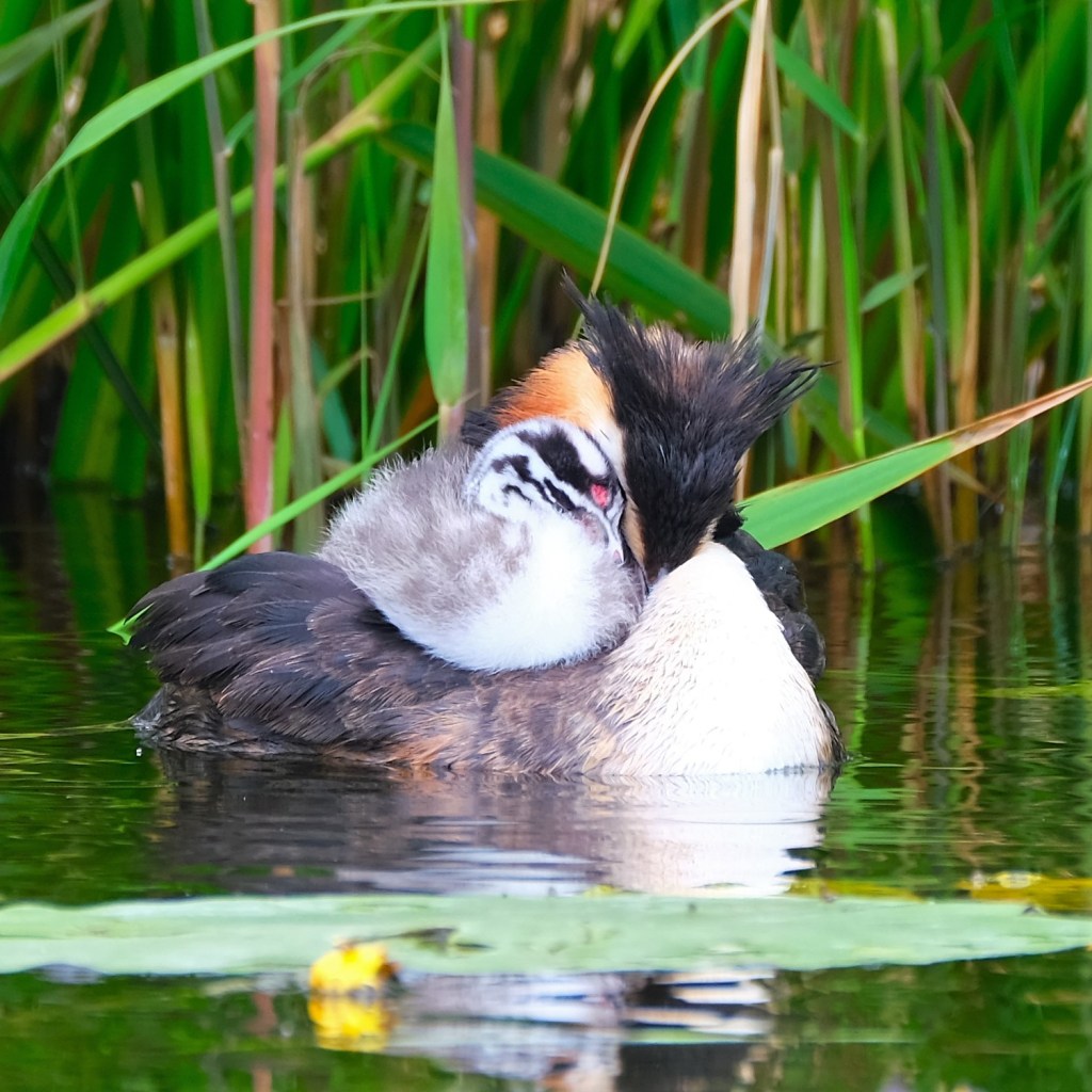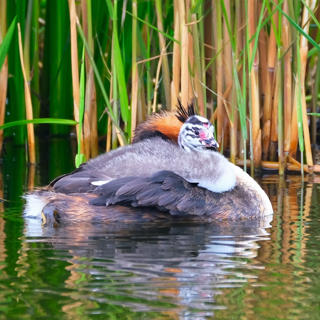 Around the next corner and a bit further along, the path runs beside a larger canal, and as I rode by, I caught a glimpse of a sleeping great crested grebe. Even though I’ve gotten some pretty good images so far, I never know if I might be able to get a better one, and there is one in particular I’ve been hoping for. Well, today was my lucky day because here it is, a grebe chick on its mom’s back.