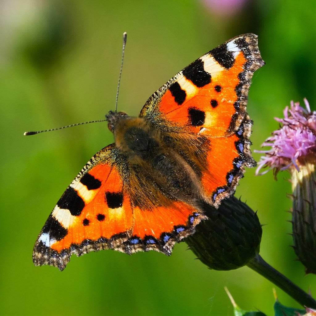 And finally, here’s a nice splash of color, a small tortoiseshell butterfly (Aglais urticae) feeding on the nectar of a batch of thistles growing beside the bike path. I read that they lay their eggs “on the common nettle, on which the larvae feed,” and I’ve got no complaint with that!