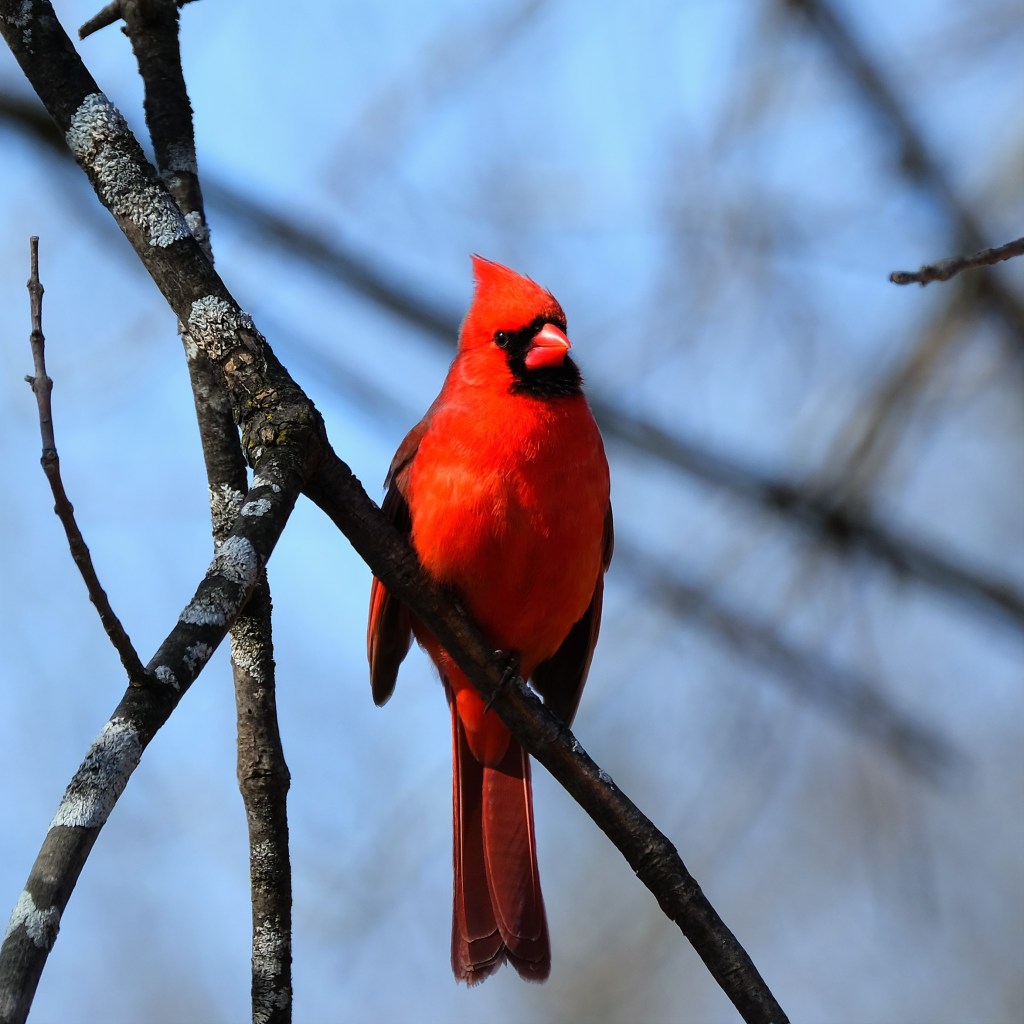 There was one red-winged blackbird calling from the treetops again, and several cardinals flitting about, but the usual crowds of house finches and house sparrows were still absent.