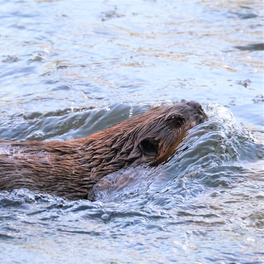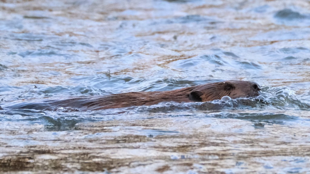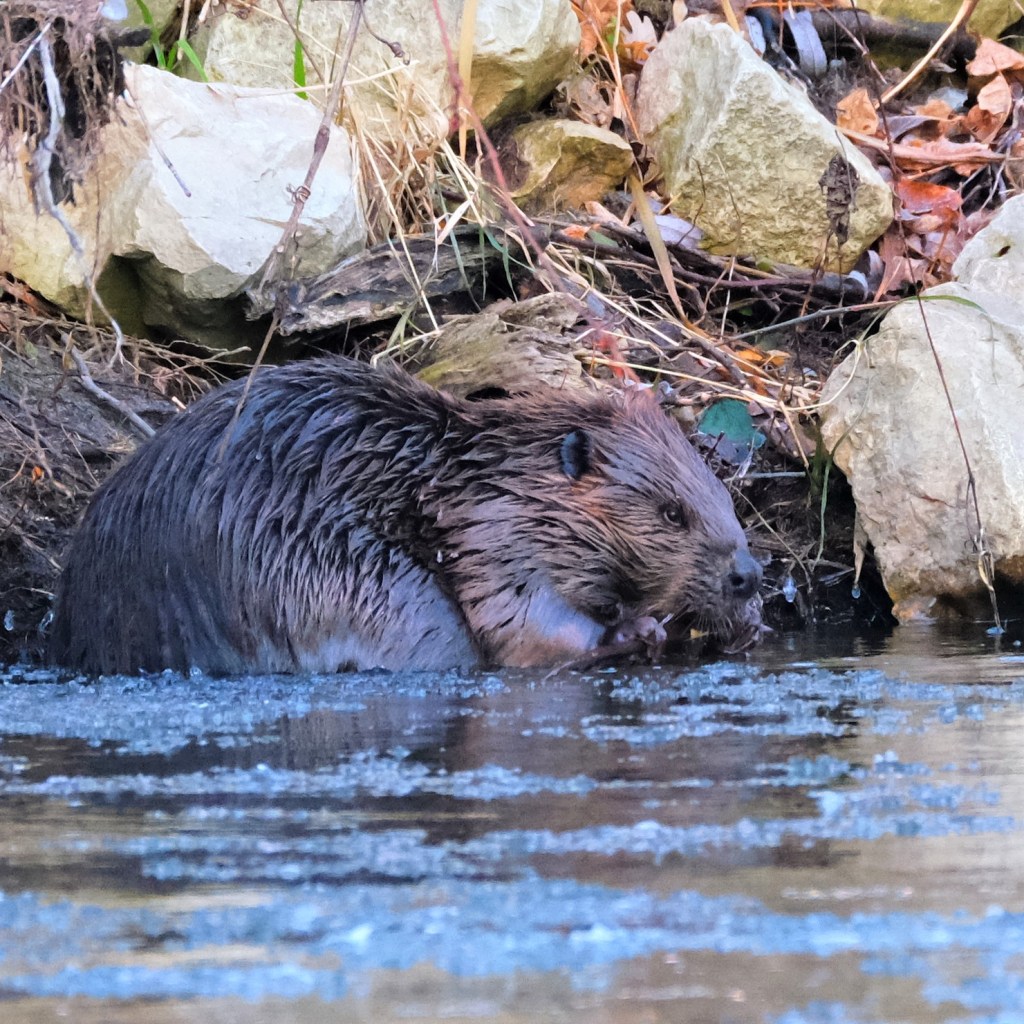 Sure enough, a beaver was having one last snack before heading off to bed, and yes, that’s ice floating in the foreground. Once it finished with that little stick, it swam across the river…