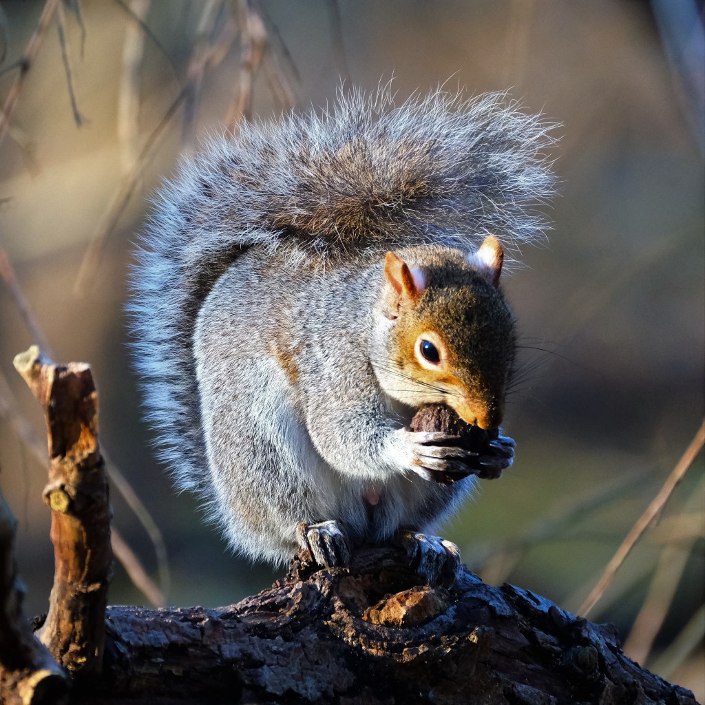 Meanwhile, here’s a grey squirrel beside the river and back at its breakfast now that the eagle has safely flown back north.