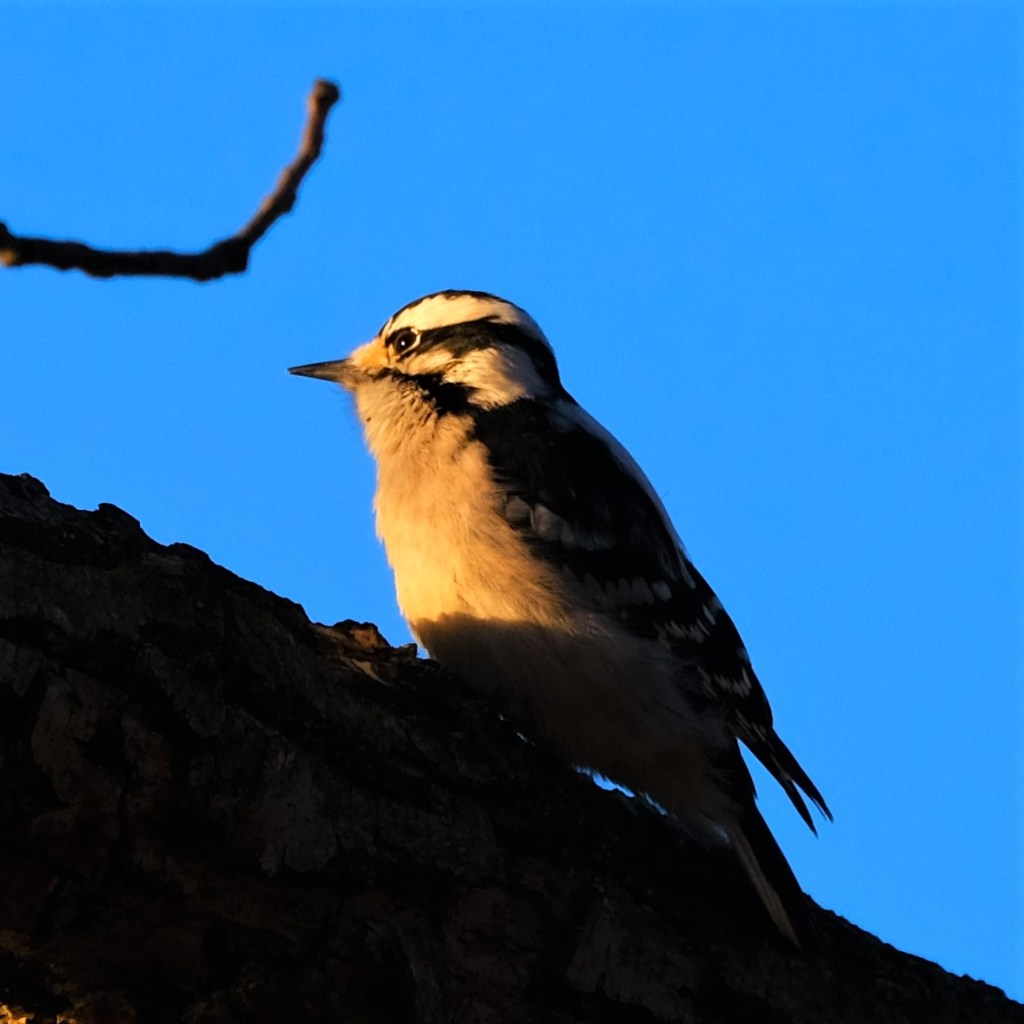 This downy woodpecker caught some of that same glow just a bit upstream.
