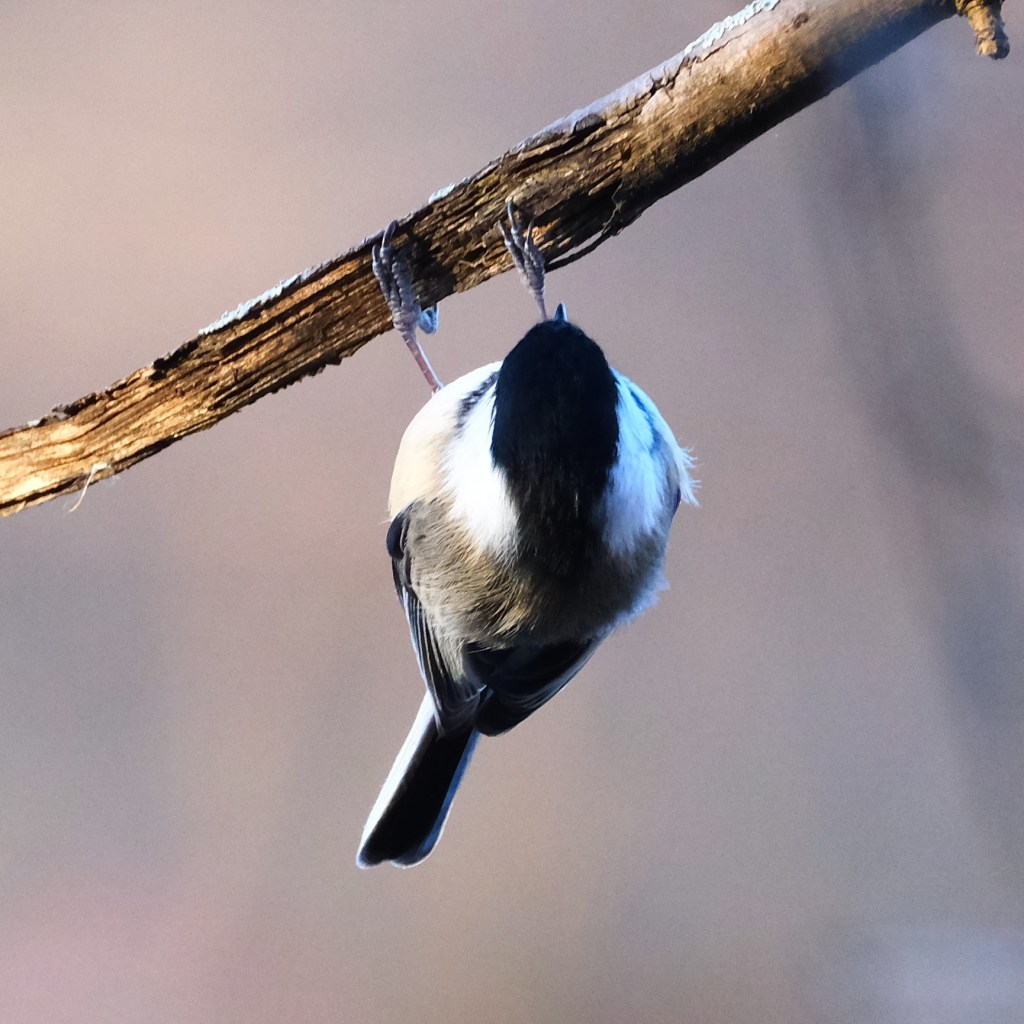This chickadee nearby was probably warm enough from all its acrobatics that it didn’t need the sun either.