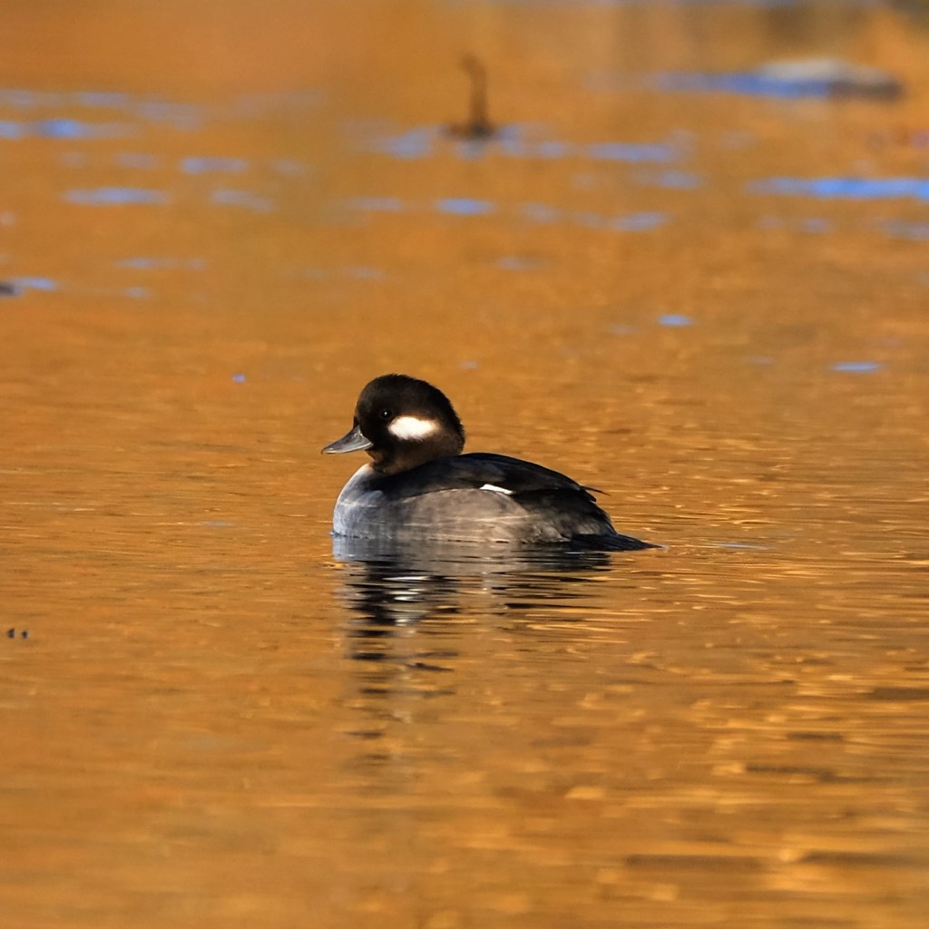 Things quieted back down until I reached the north end, where I found a bufflehead dawdling near another bunch of mallards. Once again, I managed to be on the other side of a nice screen provided by a fallen willow tree, and so the bird seemed not to notice me, and I was able to sit and wait for it to pass in front of a gap in the screen as it drifted back and forth.