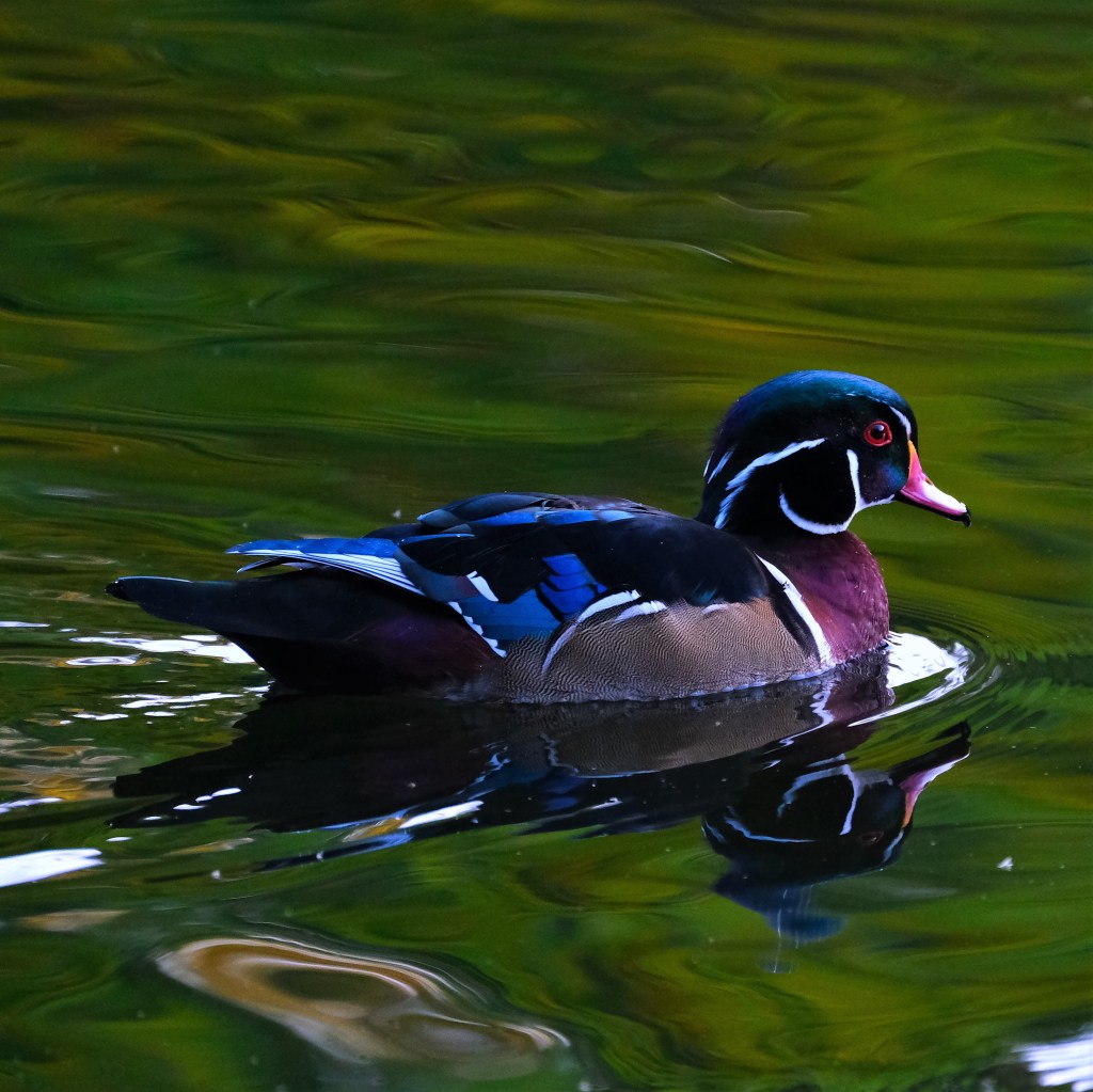 The little yellow duckling was swimming around on the pond again this morning, along with nearly two dozen wood ducks, and here’s a handsome one.
