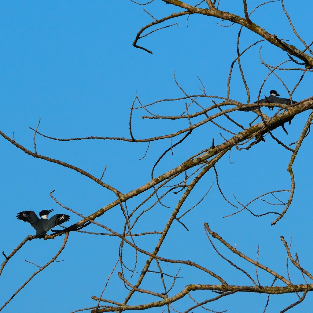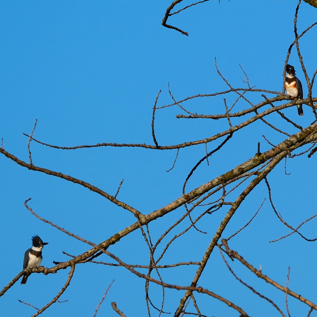 There were no herons or anything else new, so I quickly moved on to the river. At the north end, I spotted this male and female belted kingfisher having an animated conversation in the top of a tree over the island.