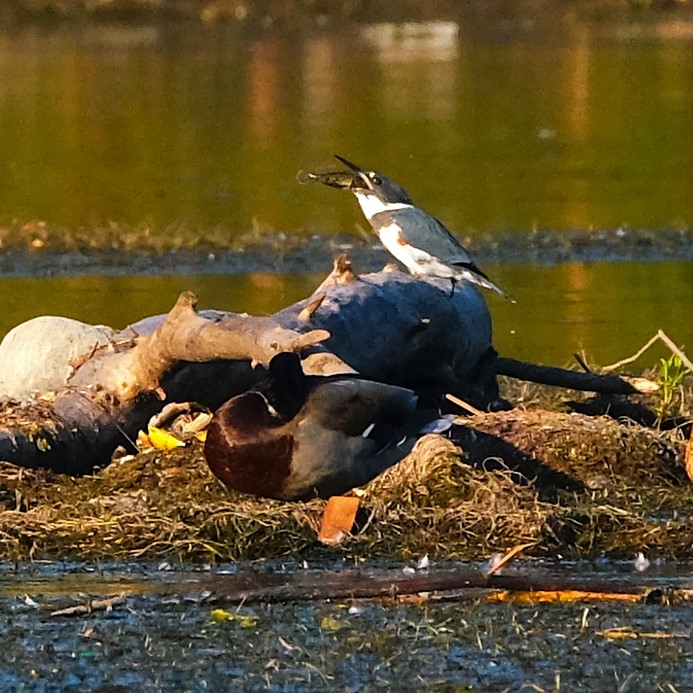 Unfortunately, the cormorant wasn’t ready, so here’s a better one of the cormorant with the heron and a bonus mallard hen, but without the kingfisher. It was a regular wild kingdom out there yesterday morning.
