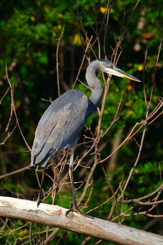 As I was doing my best to capture a decent junco image as they stuck to the shaded riverbank, a blue heron landed in a well-lit branch on the far shore.