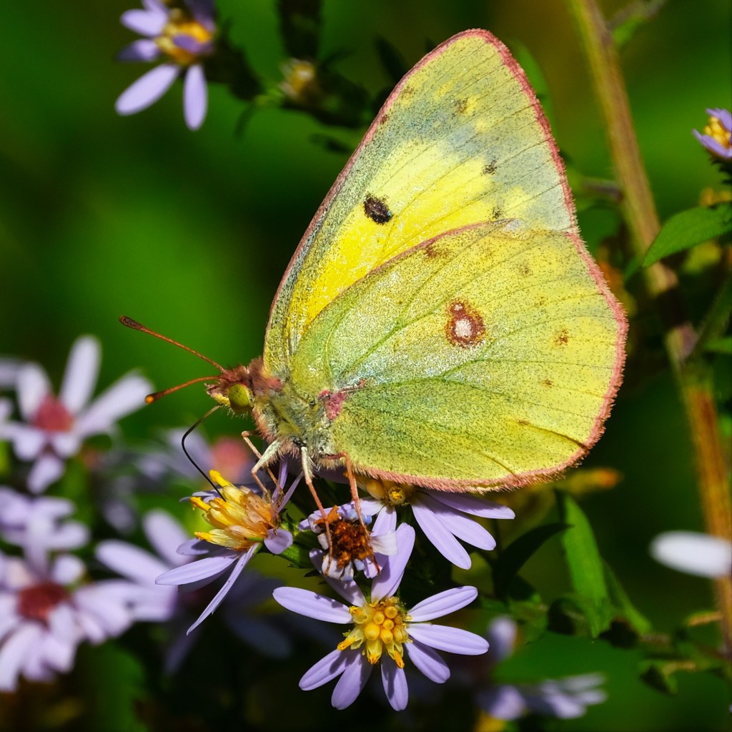 Lastly, when nature only gives us cabbage whites and sulphurs, I guess I’d better take pictures of cabbage whites and sulphurs, eh? Well, in that case, here’s a sulphur from this morning sipping nectar from the pretty little light-purple asters beside the Oak Leaf Trail.
