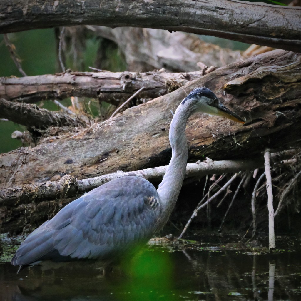 There was a slight breeze to keep the skeeters down so I made myself comfortable on the bench and waited patiently to see if the heron would do anything interesting. After a bit, someone walked by and flushed out a green heron that I hadn’t spotted. Happily, I didn’t need to move so it ignored me and got right back to fishing. First it grabbed a frog.