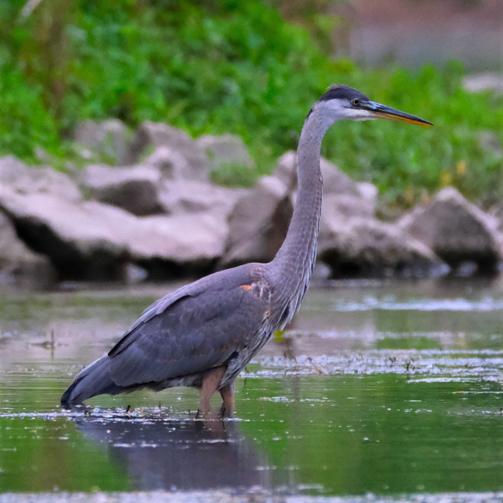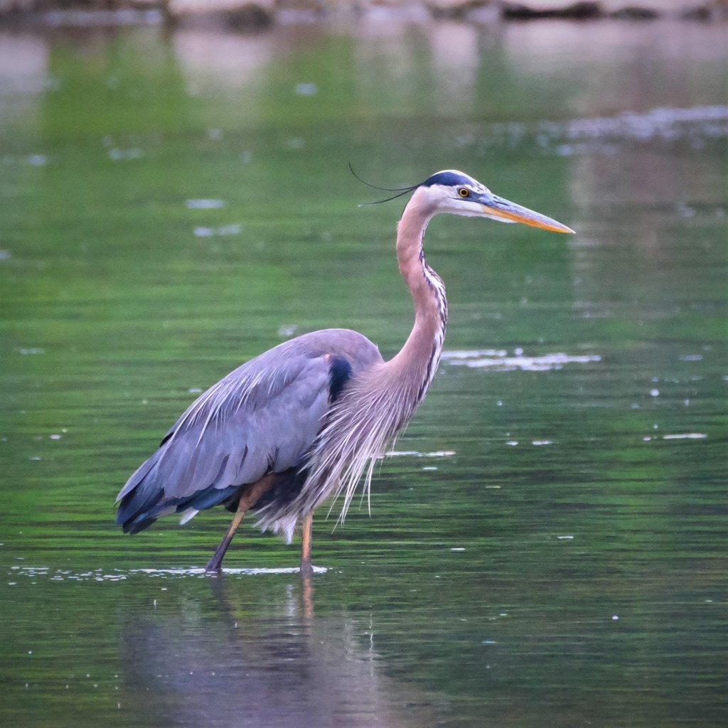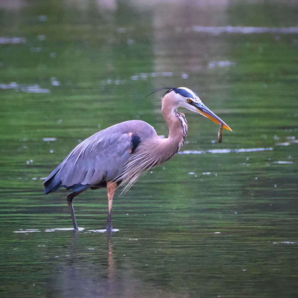Between the islands, I spotted our third blue heron of the morning, an adult this time and taking a break from fishing.