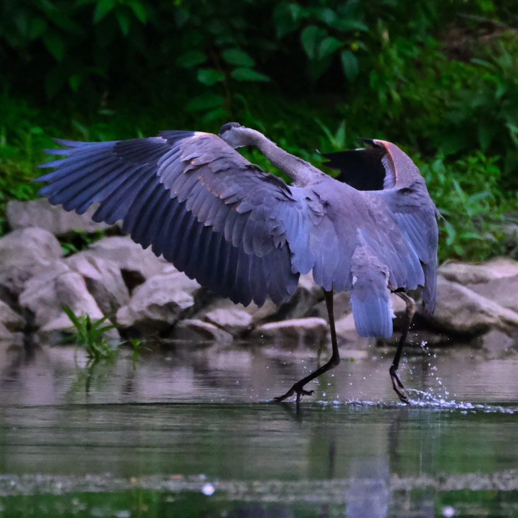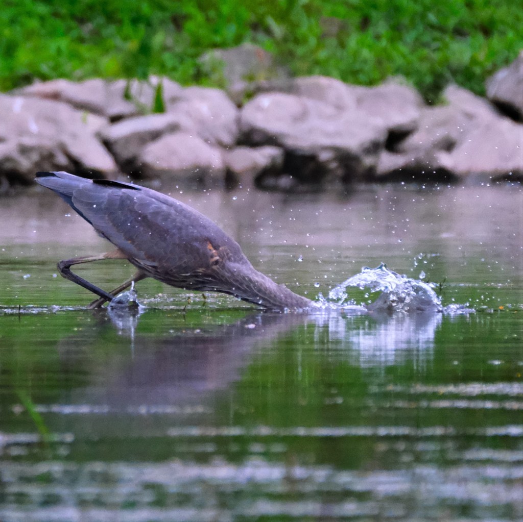 At the pond, it was a blue heron this time trying to balance on a wiggly stick, and when it finally had to resort to flying to keep from getting soaked, it spooked a second heron that I hadn’t seen. One of them flew off, and I decided to leave the one who stayed to fish in peace.