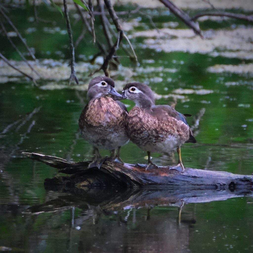 I hadn’t seen the ducklings on my first pass of the pond, so I stopped in again on my way back south, and Mrs. Wood Duck’s special friend is back and sharing a tender moment. These two are starting to make me feel like paparazzi.