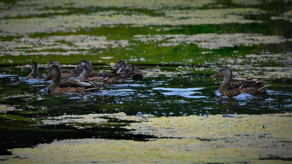 I didn’t see Mrs. Wood Duck’s new special friend, so she was giving the ducklings some attention, for a change. First, there was a winding cruise through the algal mats.