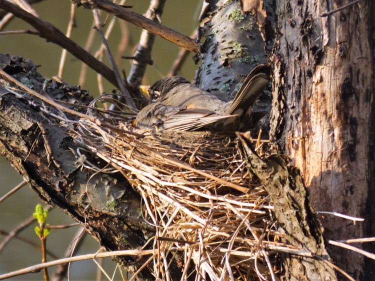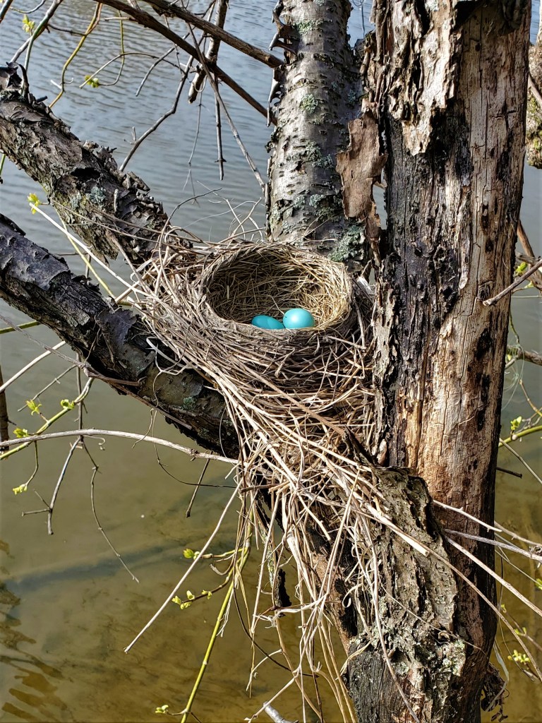 I stopped by the pond, twice, to check on our geese there, and both moms were still safely on their nests, but there was no hatching yet. Same goes for our two robins. As I reluctantly headed home, I did spot this little bit of evidence that we can hope signals a successful hatching somewhere.
